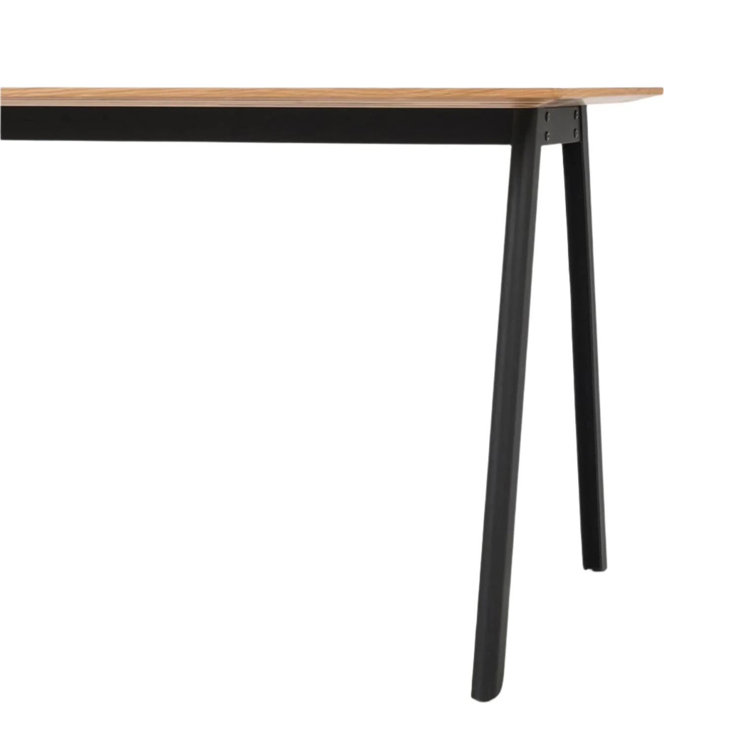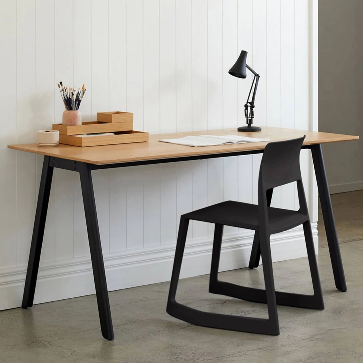 Create a modern home office with the Assembly Desk. The design features a precise and clean aesthetic with a slim plywood tabletop contrasted with black steel legs. The statement U-shaped legs connect to the floor with a discreet base plate and a tonal black rubber foot.