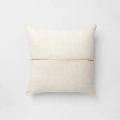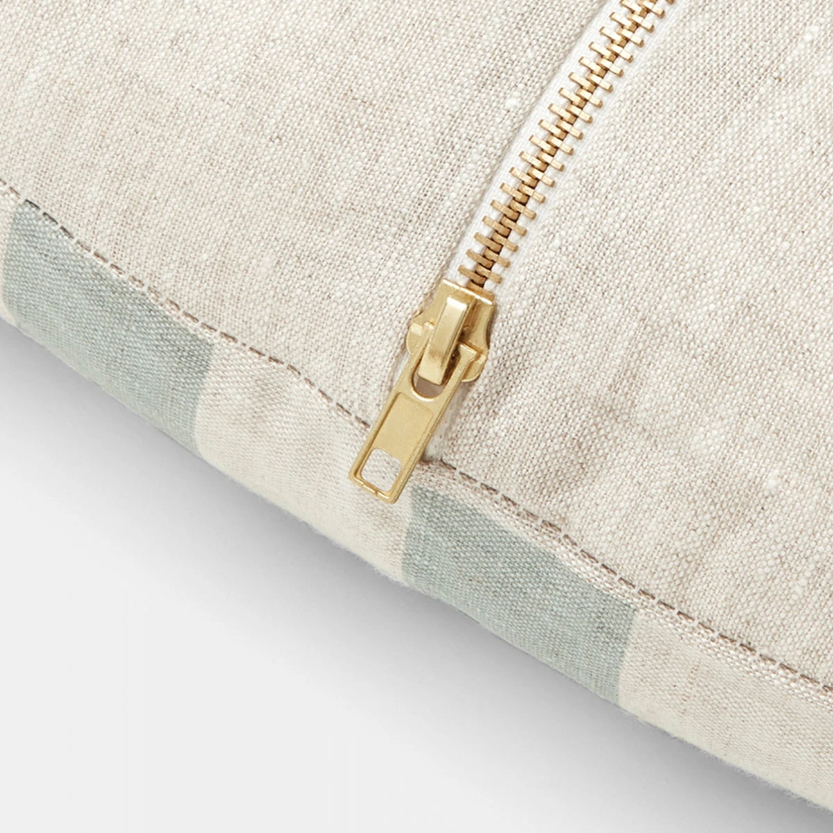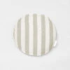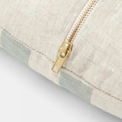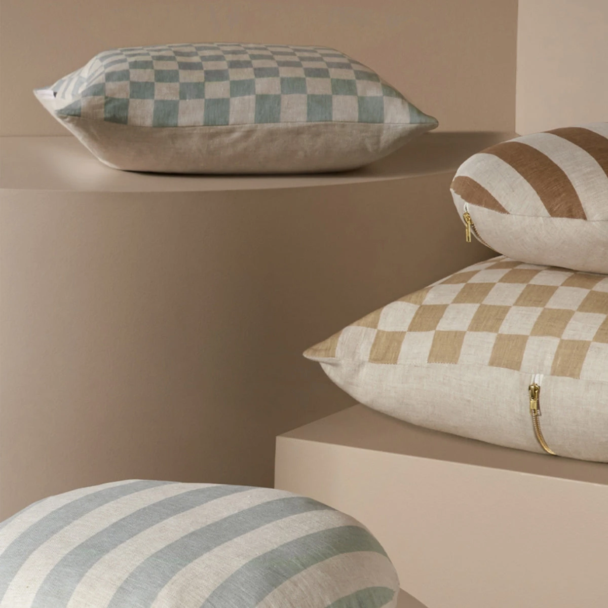 The Check Fawn Round Cushion features a natural linen case with a modern screenprinted geometric pattern. This cushion contains a feather insert with an exposed brass zip on the reverse.