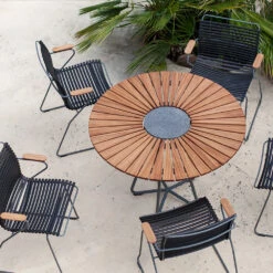 A beautiful and well proportioned dining table for your garden that enables free seating as the leg construction is drawn. Circle table for outdoor use diameter 150 cm with table top in bamboo lamellas and leg construction in grey powder coated aluminum.