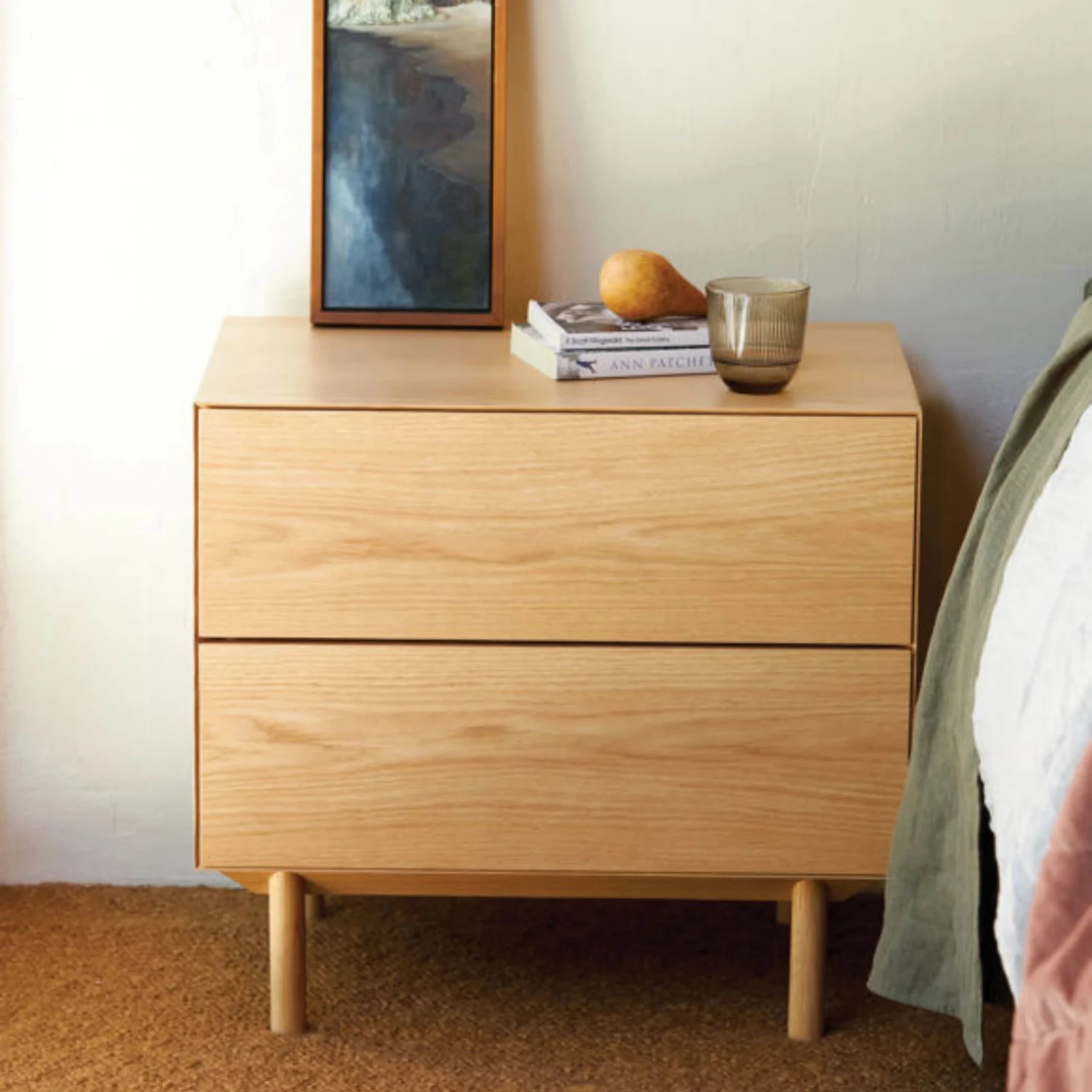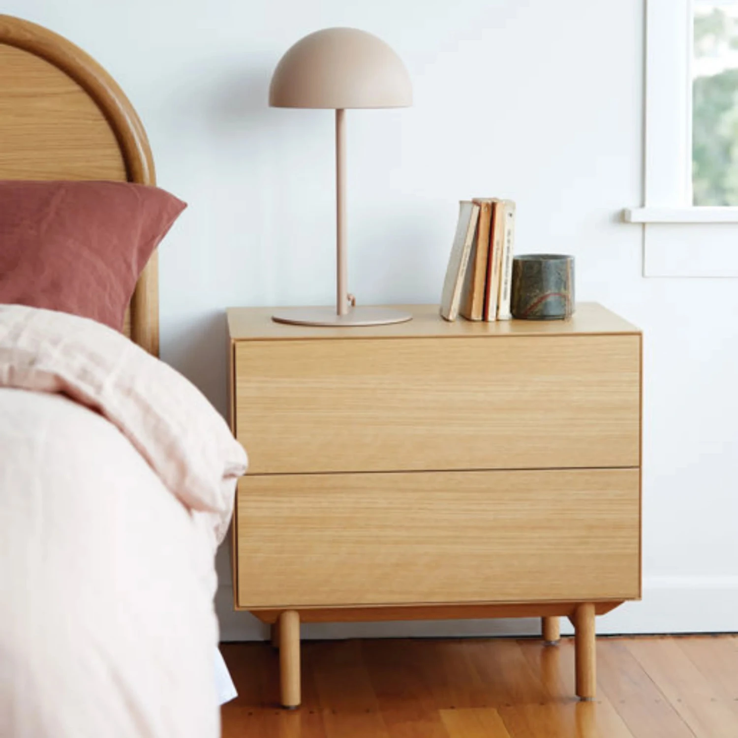 All elements of the Compound Bedside Cabinet work together in harmony to provide an elegant storage solution with two generously sized drawers. Narrow shut-lines and push-to-open mechanisms give the bedside cabinet a minimal, elegant aesthetic.