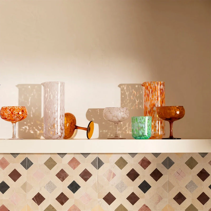Our Dots Pink carafe is made from hand-blown glass featuring specks of opaque and clear coloured glass. Designed to complement our Dots tumblers, this beautiful carafe looks at home on your dining table, desk or bedside table! Crafted with care it is made to last well into the future.