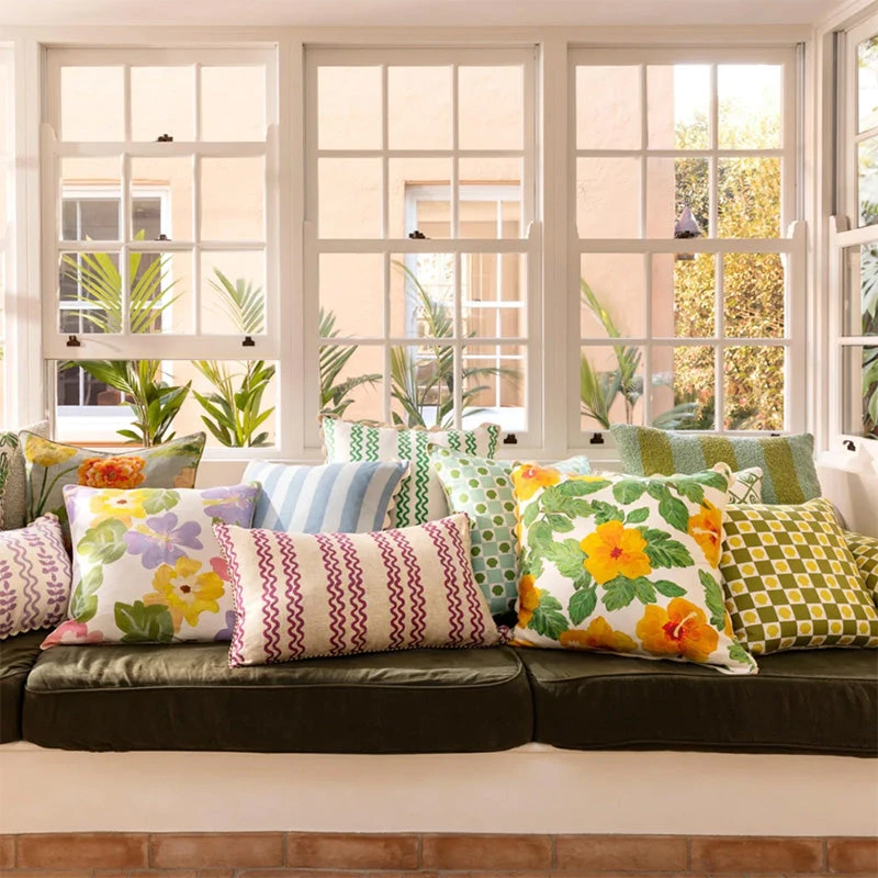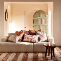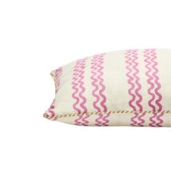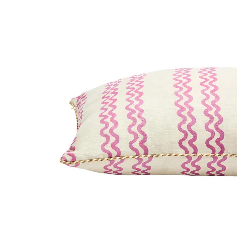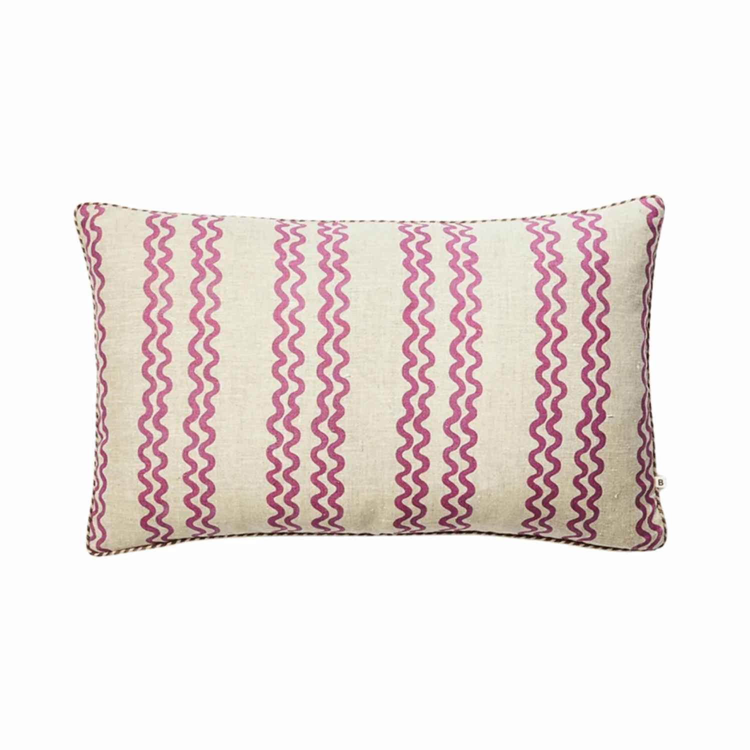 Our Double Waves Purple 75x45cm cushion features original artwork by Bonnie printed on oat linen. The reverse of the cushion features the same design printed on oat linen. From our Waikiki collection, this 75cm x 45cm cushion is finished with a rust raffia trim and includes a plush feather inser