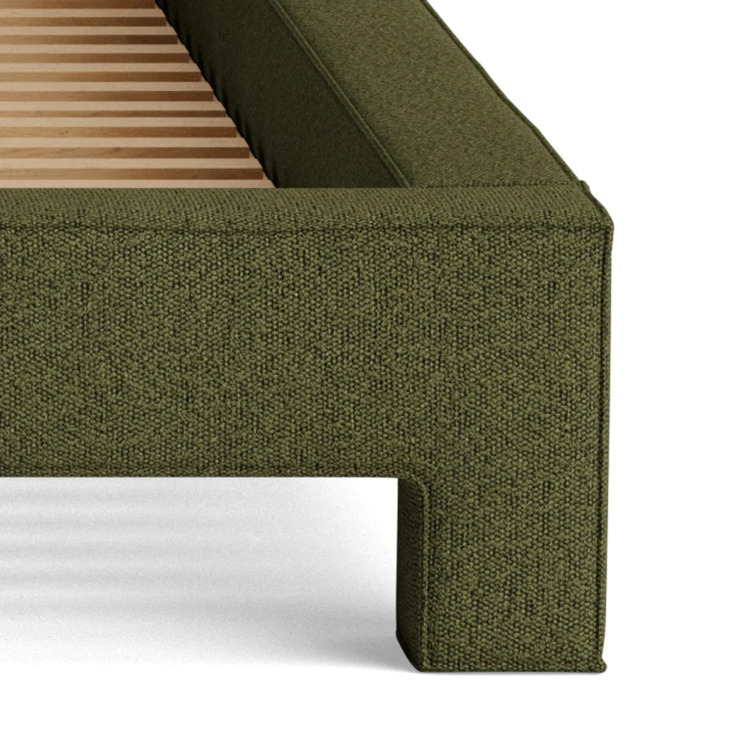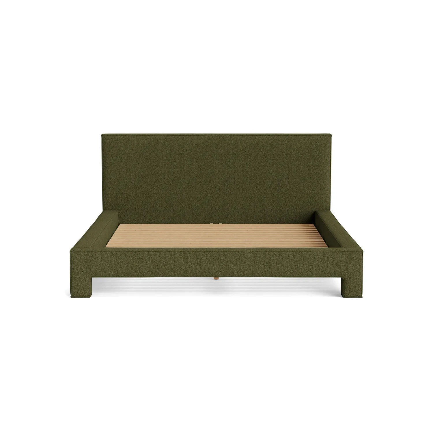 The Doze King Bed features a contemporary design, showcasing chunky upholstered legs and a luxurious thick headboard. It is designed in Melbourne, and features a textural boucle fabric that offers a unique design edge.