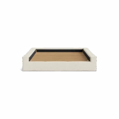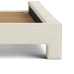 The Doze Queen Bed Base features a contemporary design, showcasing chunky upholstered legs. It is designed in Melbourne, and features a textural linen blend fabric that offers a unique design edge.