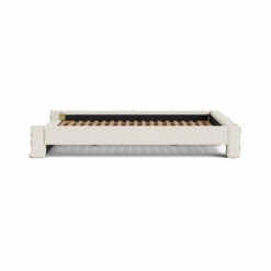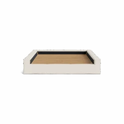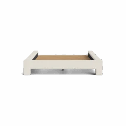 The Doze Queen Bed Base features a contemporary design, showcasing chunky upholstered legs. It is designed in Melbourne, and features a textural linen blend fabric that offers a unique design edge.