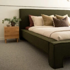 The Doze Queen Bed features a contemporary design, showcasing chunky upholstered legs and a luxurious thick headboard. It is designed in Melbourne, and features a textural boucle fabric that offers a unique design edge. Crafted with care it is made to last well into the future.