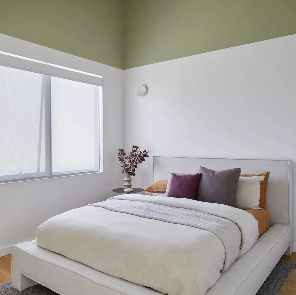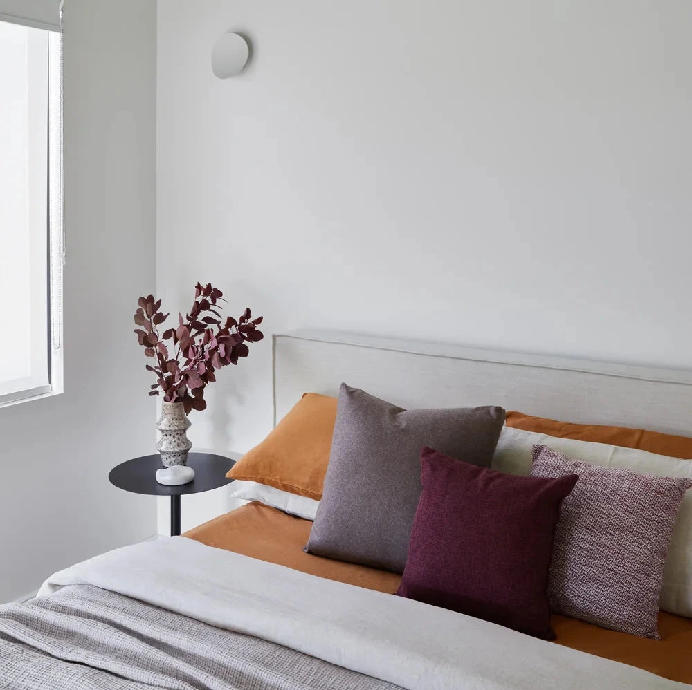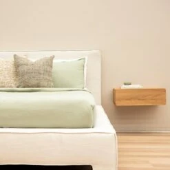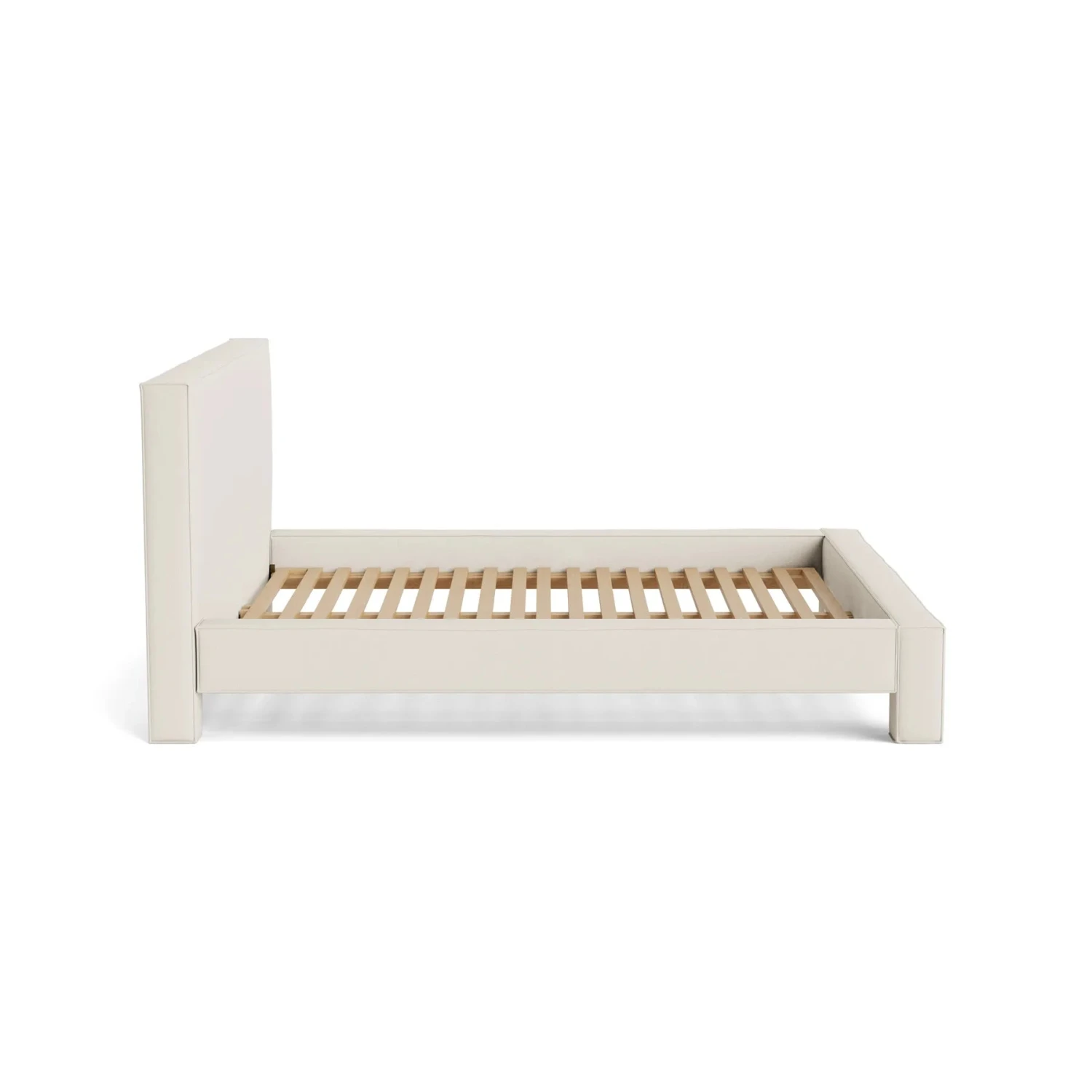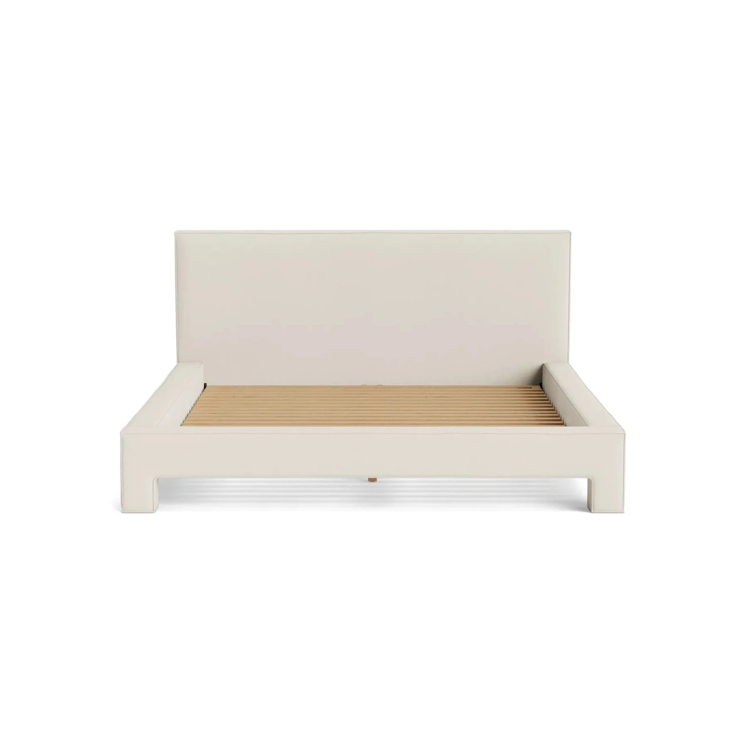 The Doze Queen Bed features a contemporary design, showcasing chunky upholstered legs and a luxurious thick headboard. It is designed in Melbourne, and features a textural linen blend fabric that offers a unique design edge.