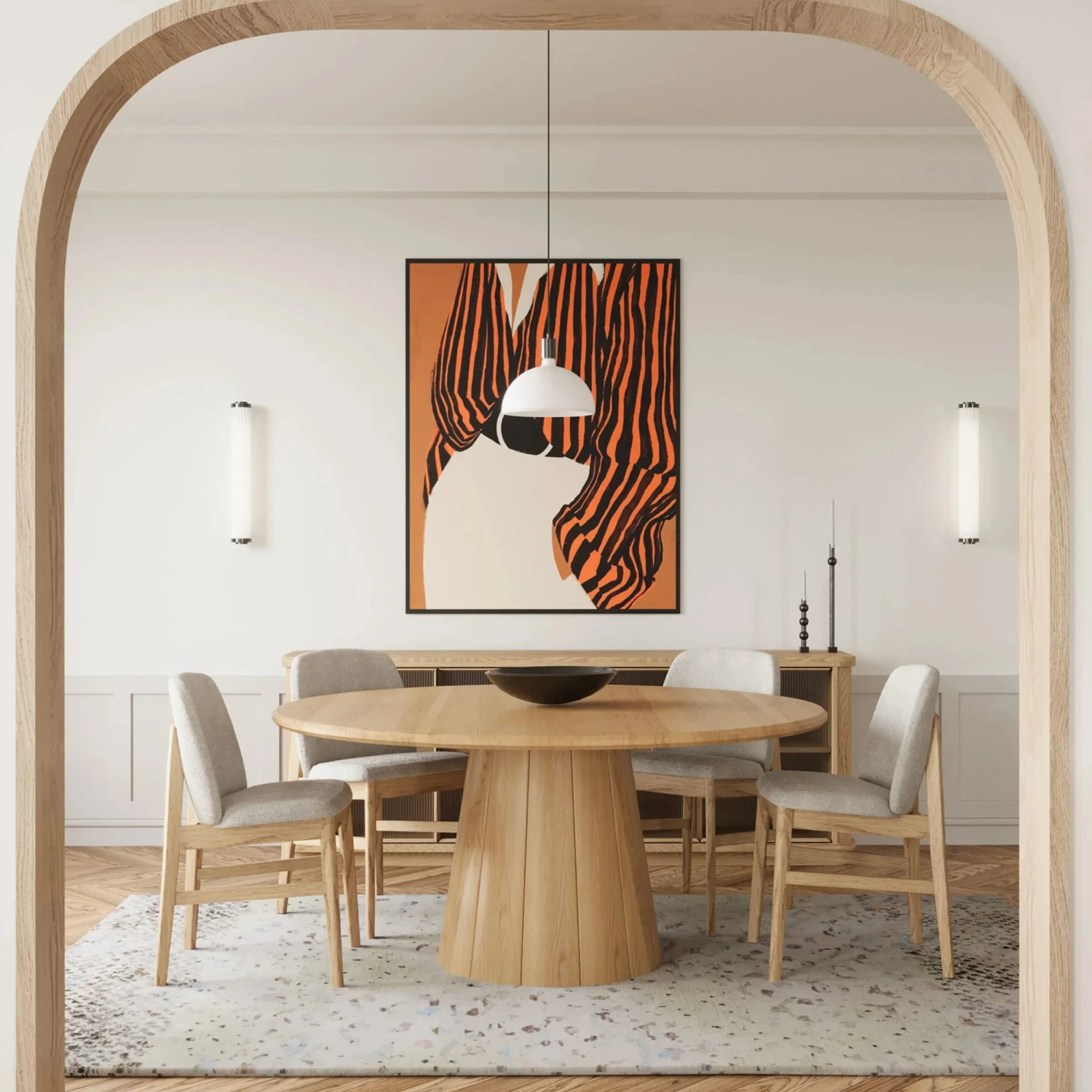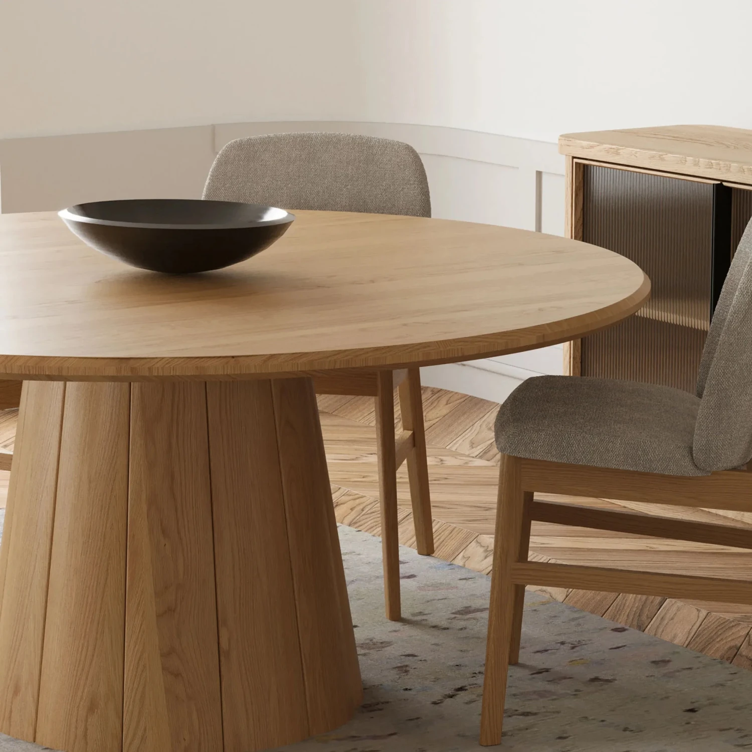 The Elliot dining range embraces a contemporary and elegant homage to craftsmanship and fine detailing. An intricate base with domed panels creates a minimal round dining table.
