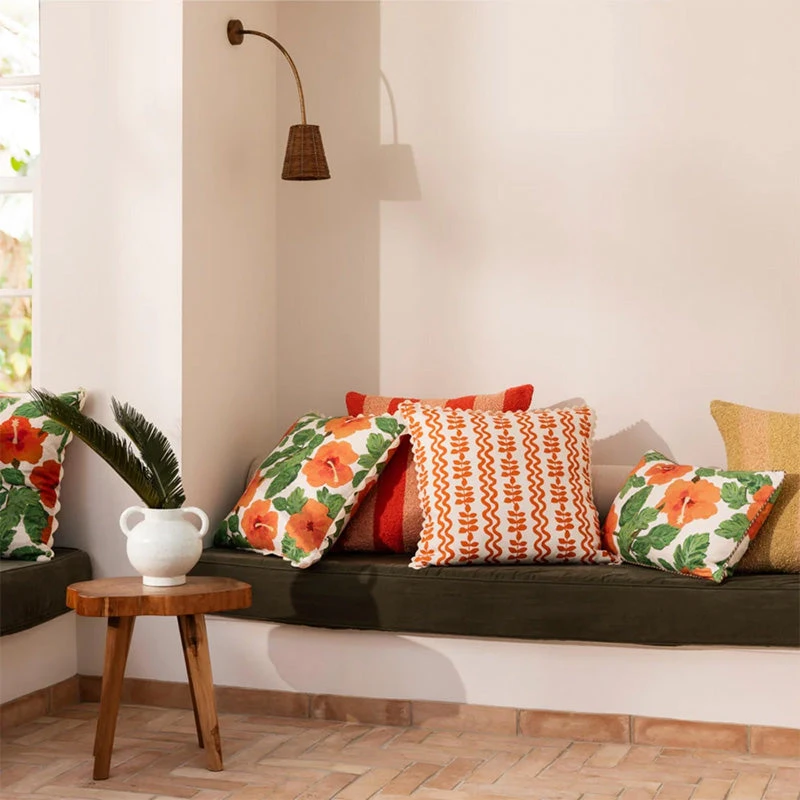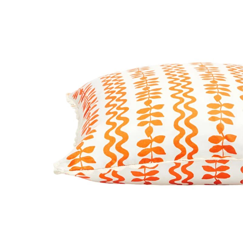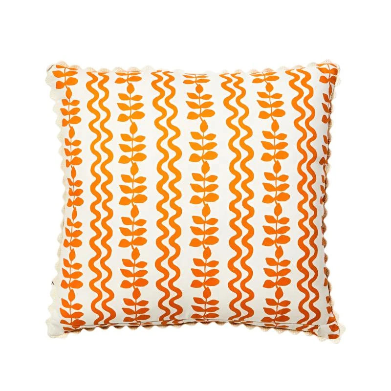 Our Ferns and Waves Rust 60cm cushion features original artwork by Bonnie printed on white linen. The reverse of the cushion features the same design. From our Waikiki collection, this 60cm x 60cm cushion is finished with a cream scalloped trim and includes a plush feather insert