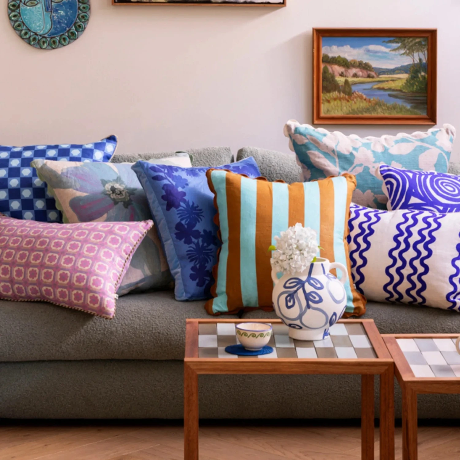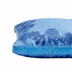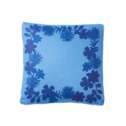 Our Flora – Blue 50cm cushion features original artwork by Bonnie printed on white linen. The reverse of the cushion features the same design.