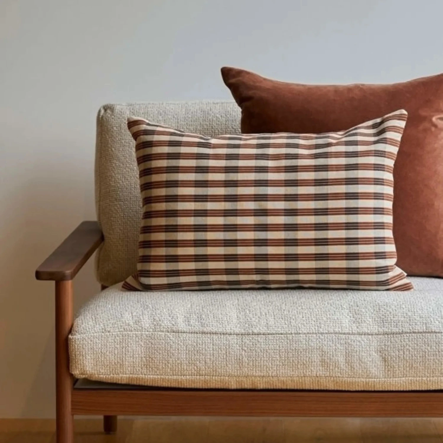 The name ‘Folio’ is a nod to classic lined paper—a minimalist grid design found in everyday life. The Folio Cushion features a simple woven grid pattern, blending warm russet and deep mulberry tones.