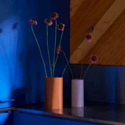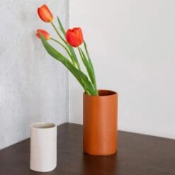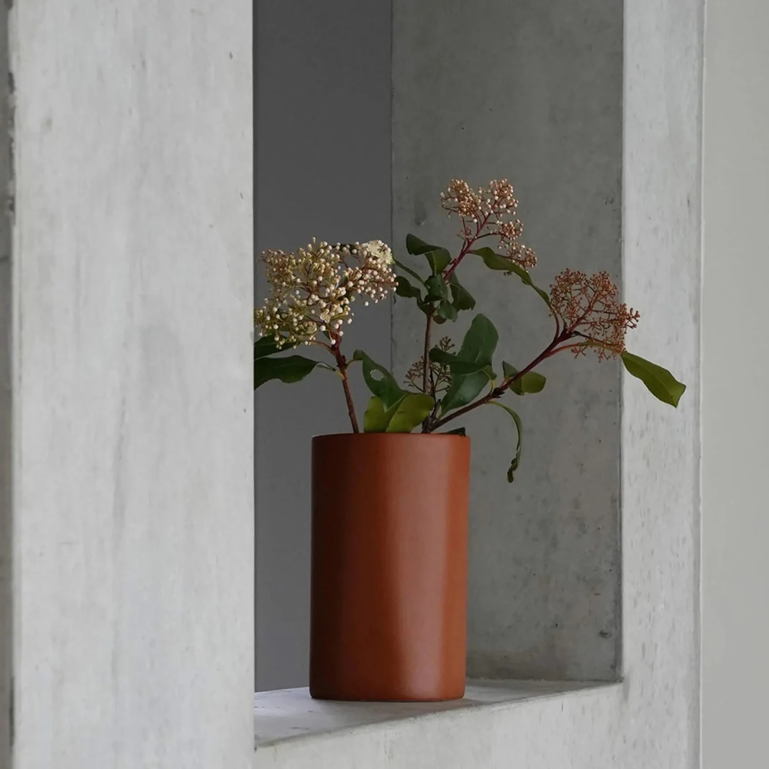 The Fossil vase design features a subtle organic form that is highlighted when the light hits from the side. The ceramic vase can be filled with flowers or displayed as a sculptural object on its own. The lightly textured bisque finish creates a beautiful contrast with the glazed interior. The vivid brick colour makes a standalone statement or mix and match with the wider Fossil range.