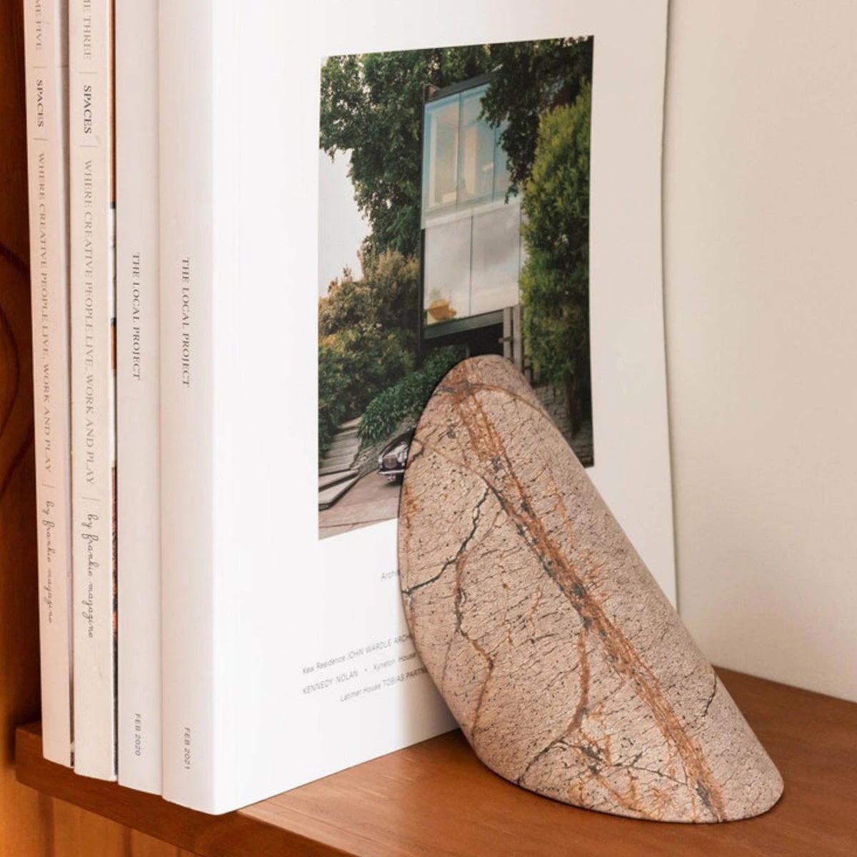 The Geo Marble Wedge can be displayed as a bookend or a sculptural object on its own. The complex tones are reminiscent of the rich forest floor, as seen from above. The wedge is skilfully hand-carved from forest brown marble. The natural minerals found within marble add to the character and makes each piece completely unique.