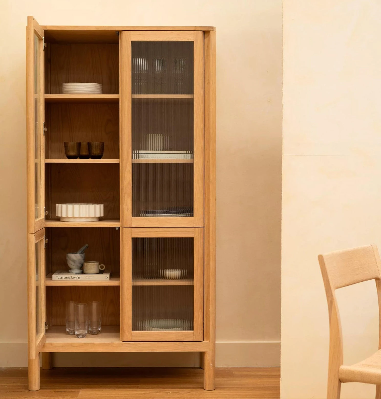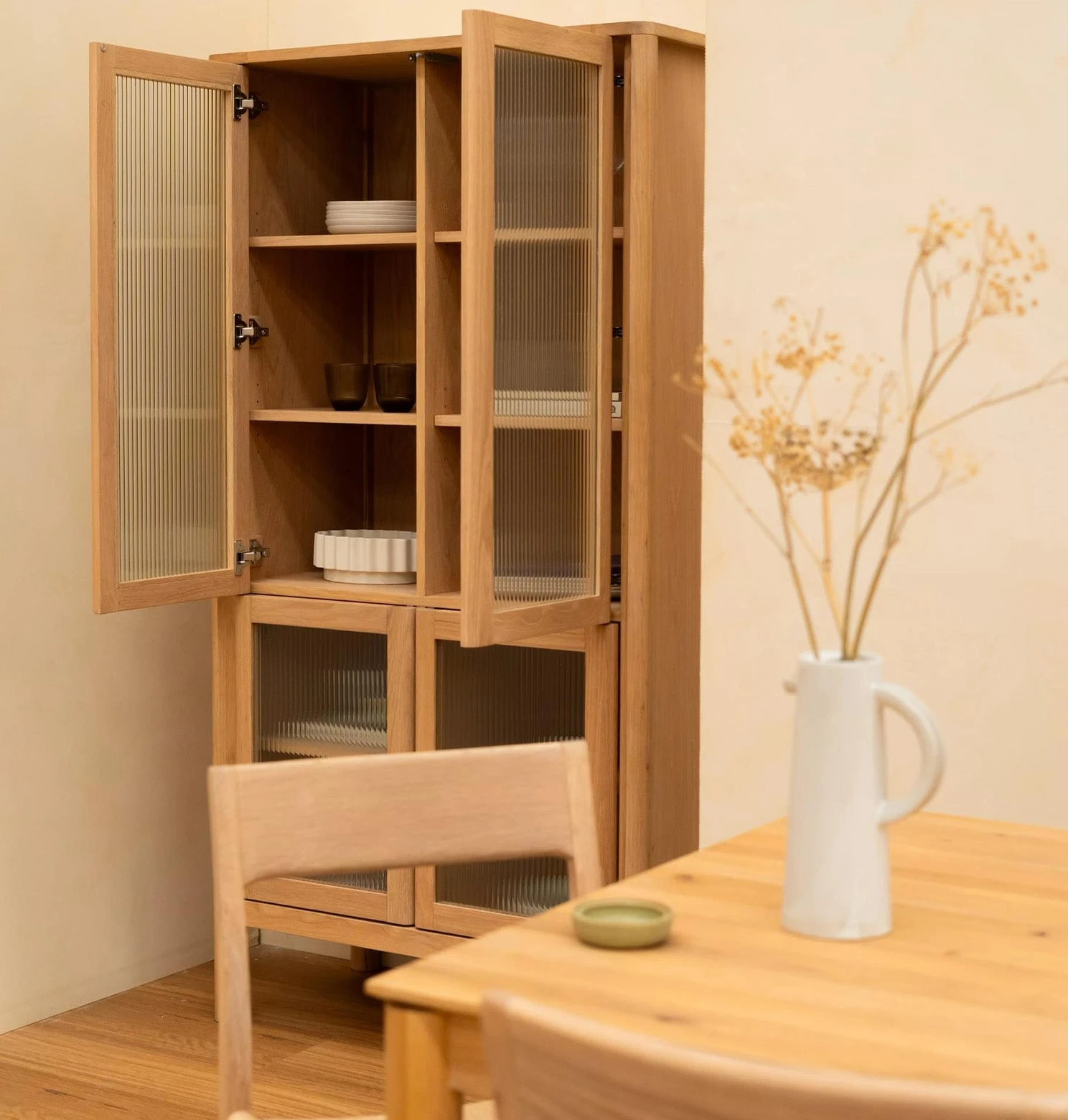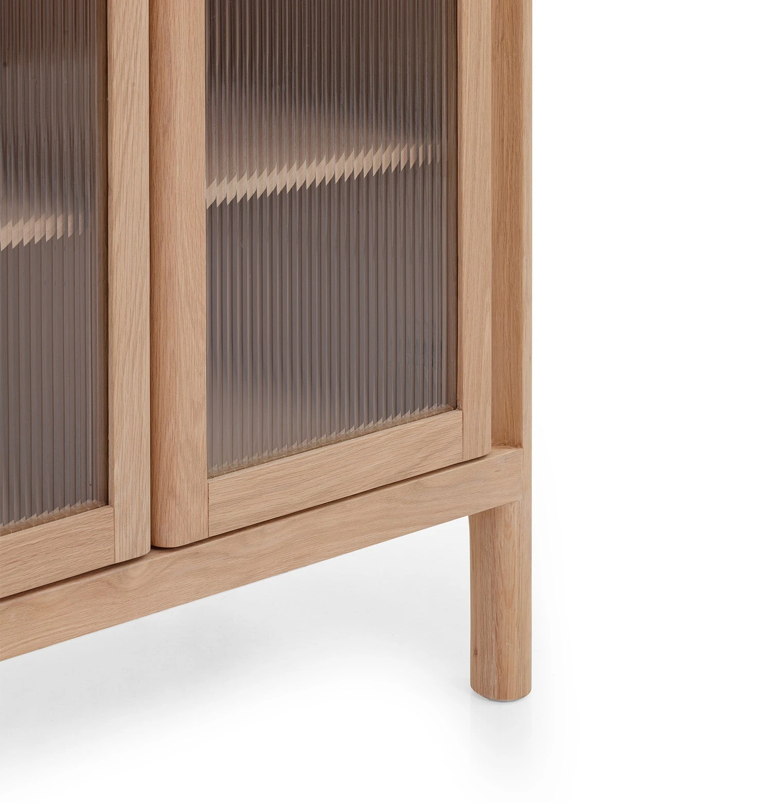 The Groove Display Cabinet combines modern aesthetics with a classic touch, featuring a sleek glass exterior and solid oak accents that create a sophisticated and contemporary design.
