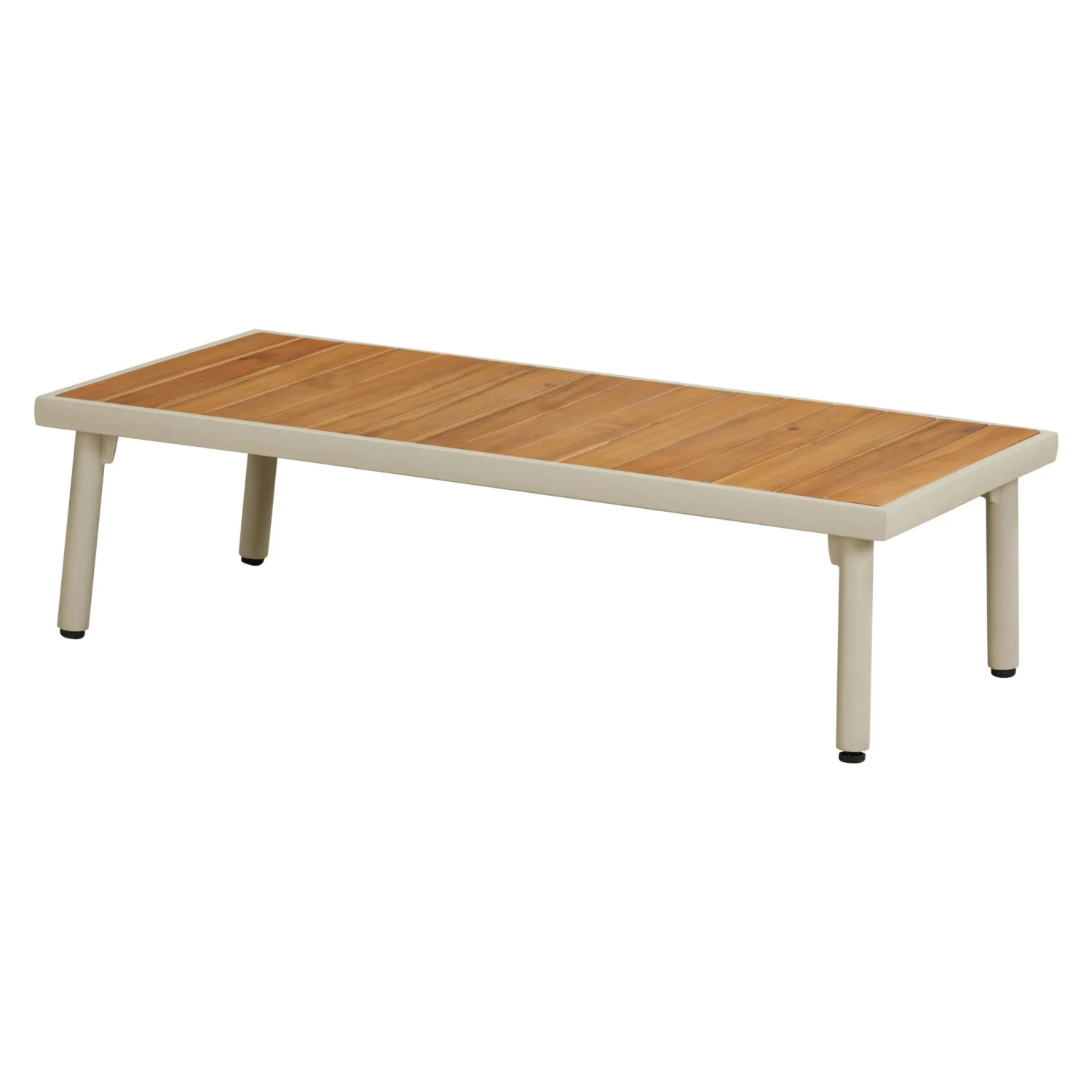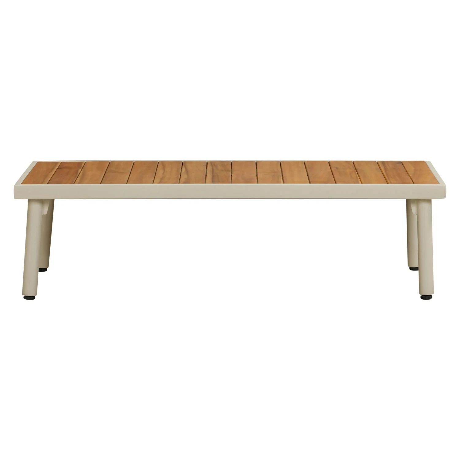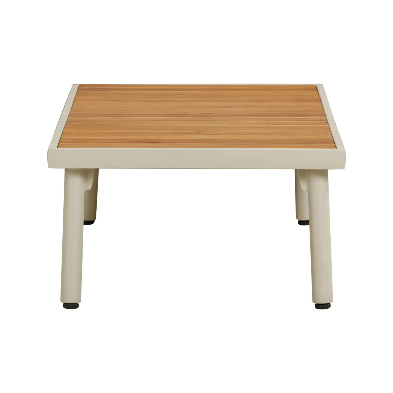Blend industrial style with natural charm with the Hattie aluminum outdoor coffee table. Featuring a sturdy, powder-coated aluminum frame, the table’s top is adorned with beautiful wood accents that add warmth and texture to its otherwise sleek design. The combination of weather-resistant aluminum and rich wood creates a durable, yet inviting, look that’s perfect for outdoor spaces like patios, gardens, and balconies.