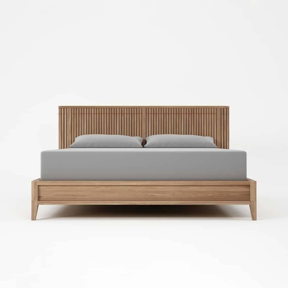 This stunning King size bed is made with solid European White Oak which has a Patina oil-based finish adding an alluring, luxuriant and warm tone to the natural, solid, European White Oak used to create the piece and features a timeless modern design with smooth curves that will be the beautiful and peaceful addition to your bedroom. Surprising features abound within the headboard.