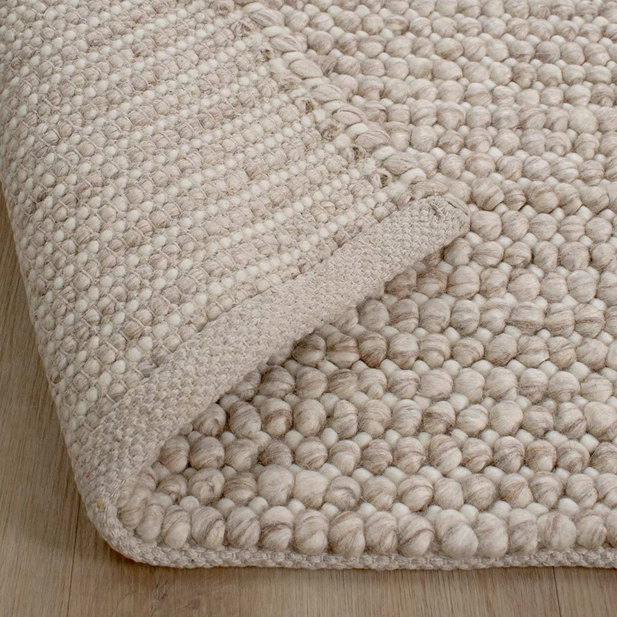 A hand woven 100% wool rug in a loop-pile textured weave. The unique texure detailing in the rug adds warth and depth to any space. With its versatile design and neutral color palette, this rug is perfect for any space. Its understated elegance and soft texture effortlessly blend into various decor styles, making it a versatile and inviting addition to any room.