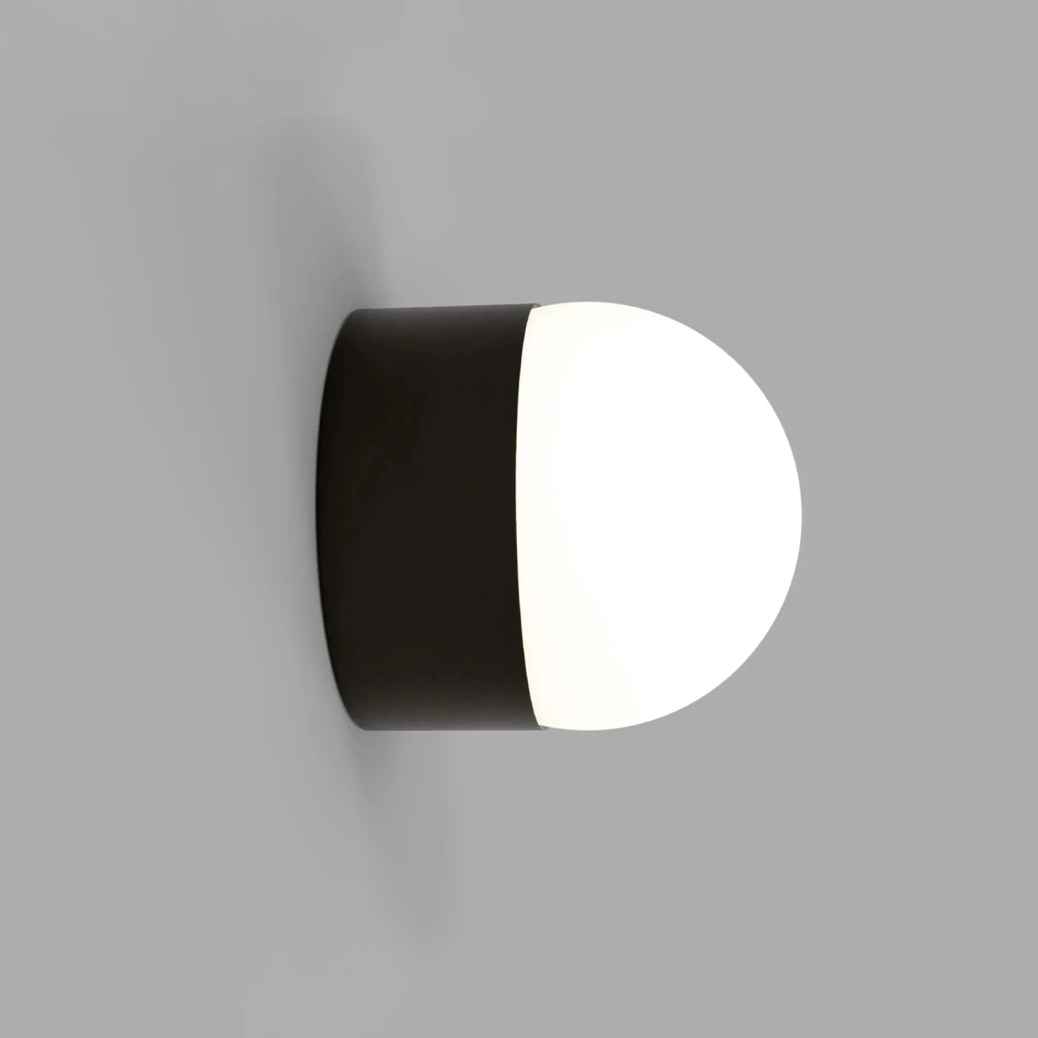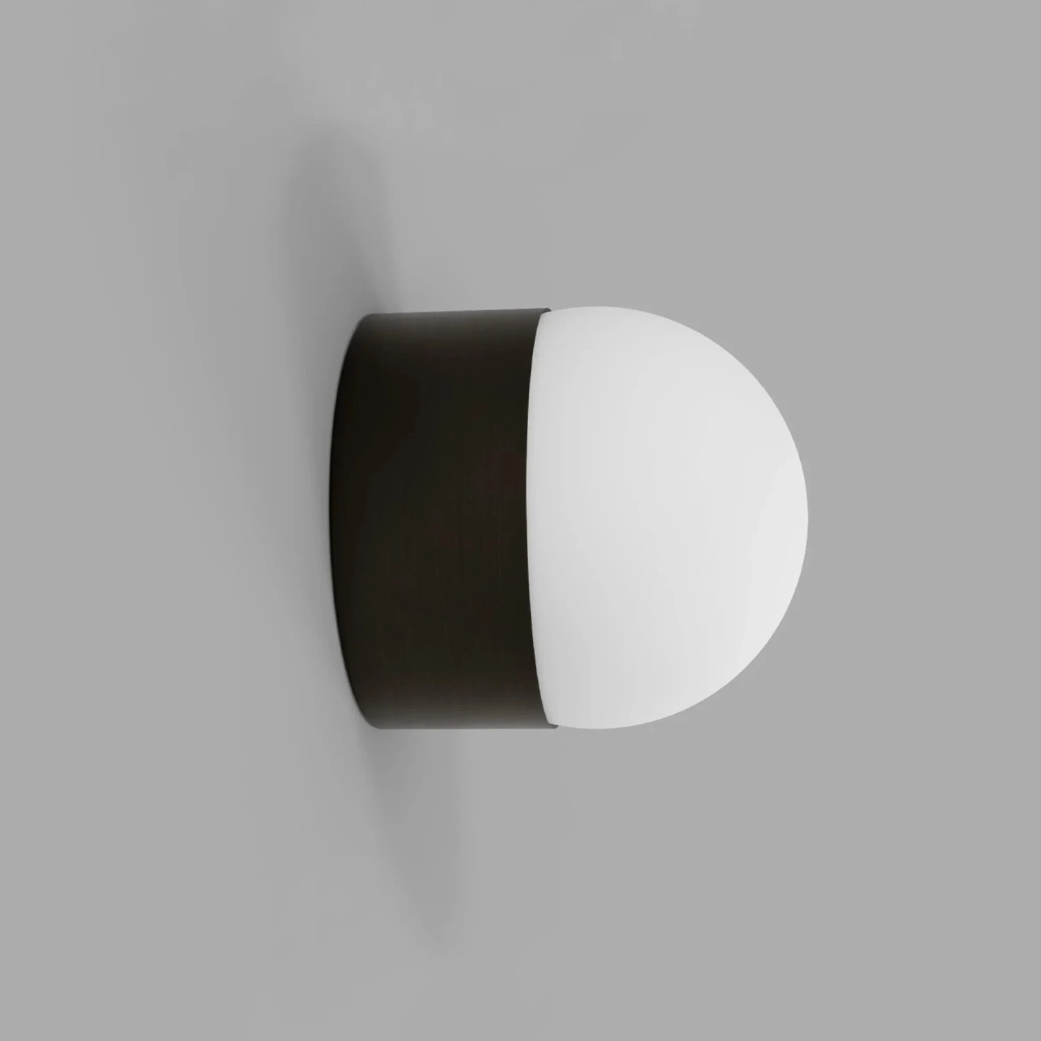 Orb Sur Wall Light by Lighting Republic takes the classic glass sphere of the Orb collection and incorporates an sleek frame, adding an extra element of depth to this most versatile wall light. The white variation features an aluminium frame while the old brass and iron feature a solid brass frame. The perfect sphere of opal glass emits a soft and diffused light and will sit comfortably in any interior setting.