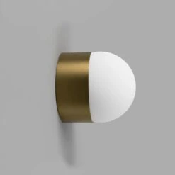 Orb Sur Wall Light by Lighting Republic takes the classic glass sphere of the Orb collection and incorporates an sleek frame, adding an extra element of depth to this most versatile wall light. The white variation features an aluminium frame while the old brass and iron feature a solid brass frame. The perfect sphere of opal glass emits a soft and diffused light and will sit comfortably in any interior setting.