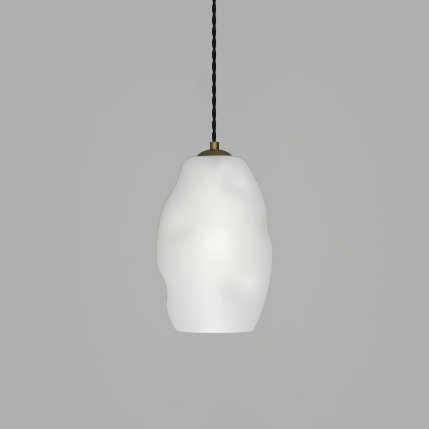 Organic Pendant Light by Lighting Republic features a bespoke turned and cast brass suspension that is delicately suspended by a twisted black cloth cord and is available in an aged brass or timeless iron finish. The varied thickness and unique details in the glass adds a subtle honesty to this product making it truly one of a kind. The Organic collection features a characteristic contour in its form. Energetic and asymmetrical, each glass shade is individually hand-blown and hand formed to give it a unique shape, no two pendants are ever the same. The way that light beams through the contours of each different glass surface provides a thrilling light diffusion.