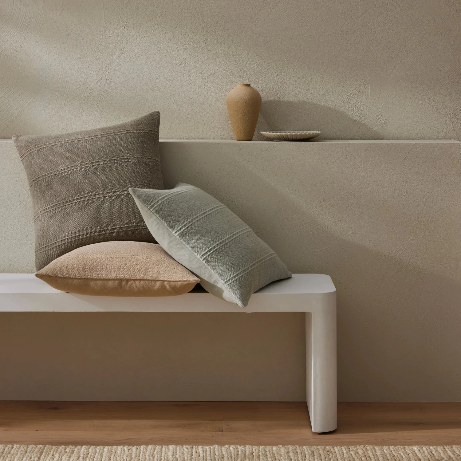 A classic plain cushion with a beautiful, subtle ribbed pattern. Soft to touch while also being durable and sturdy. The dry woven finish of Palma is tactile and refined. Shell is a warm, muted neutral. Perfect to add a touch of comfort and indulgence to your space.