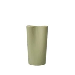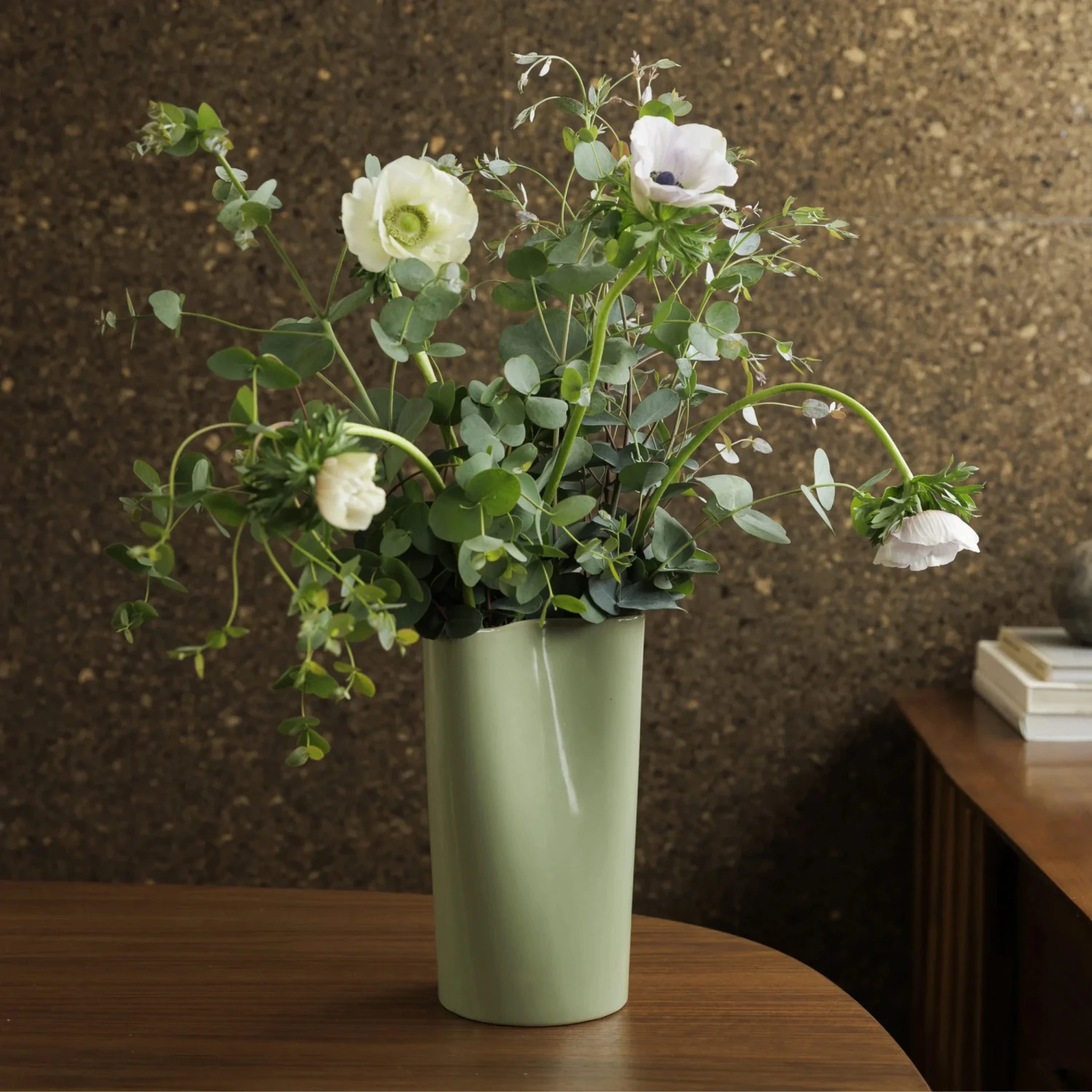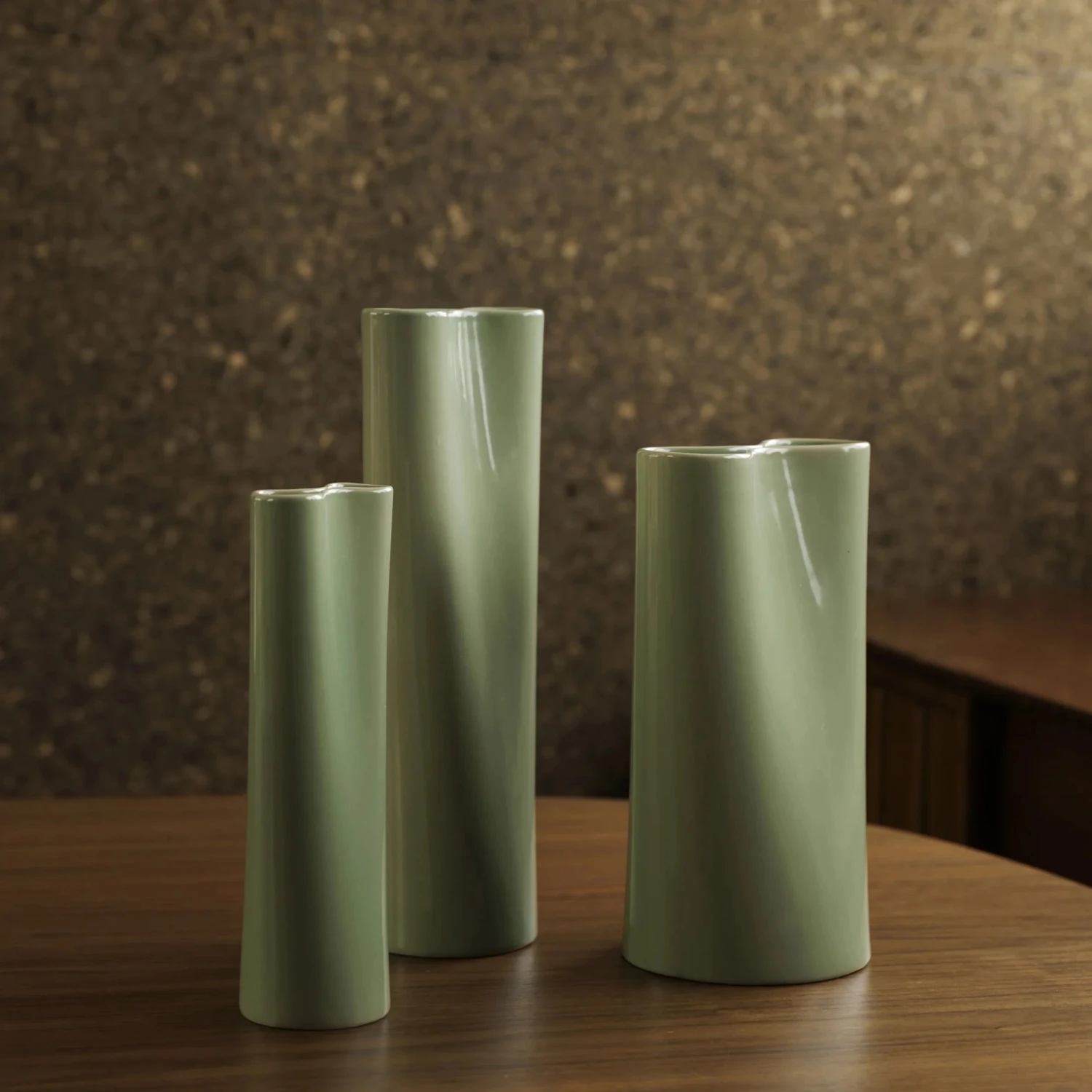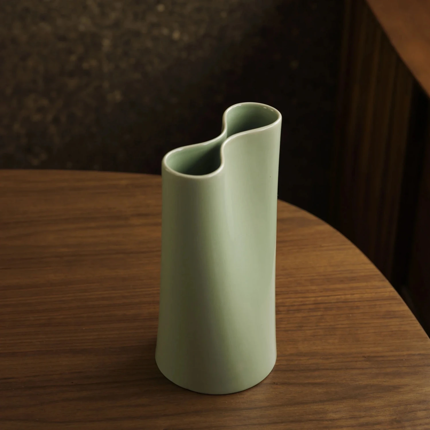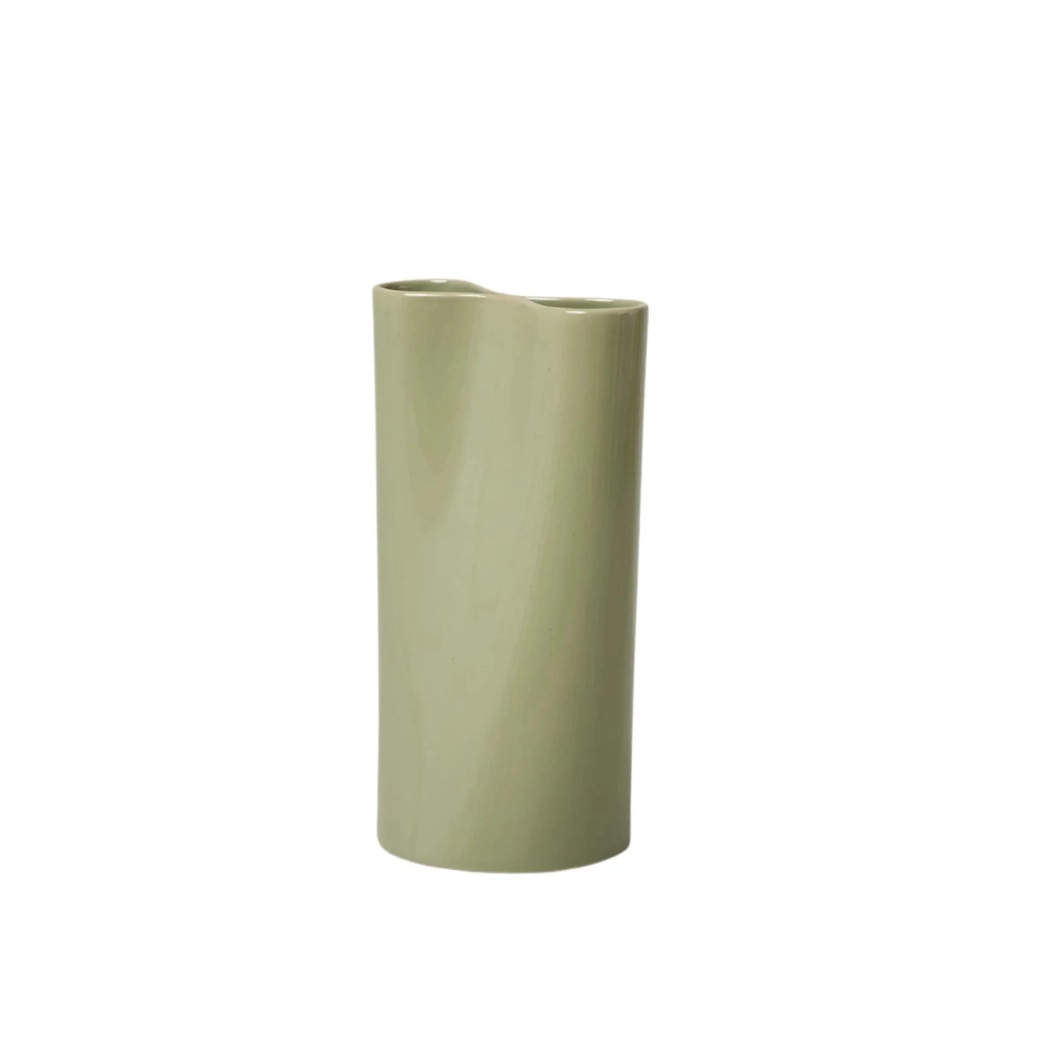 Its design features a cylindrical base that tapers into a “pinched” top, forming two distinct chambers. The base circumference is an equal measurement to the pinched contours, giving the form a harmonious, considered balance. A unique ceramic composition gives the vase strong yet elegantly thin walls.
