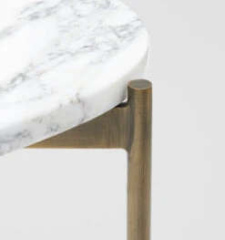 The Rhonde series by Middle of Nowhere is a range of simple, functional occasional tables that celebrate the natural beauty of marble. This Rhonde marble table has a brass look steel base, paired with an oval top featuring white marble swirled with grey, honey and beige tones.