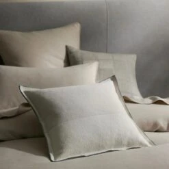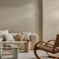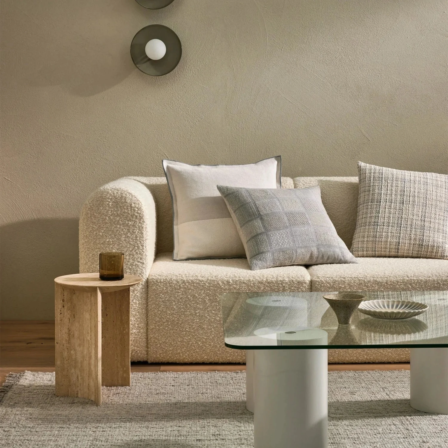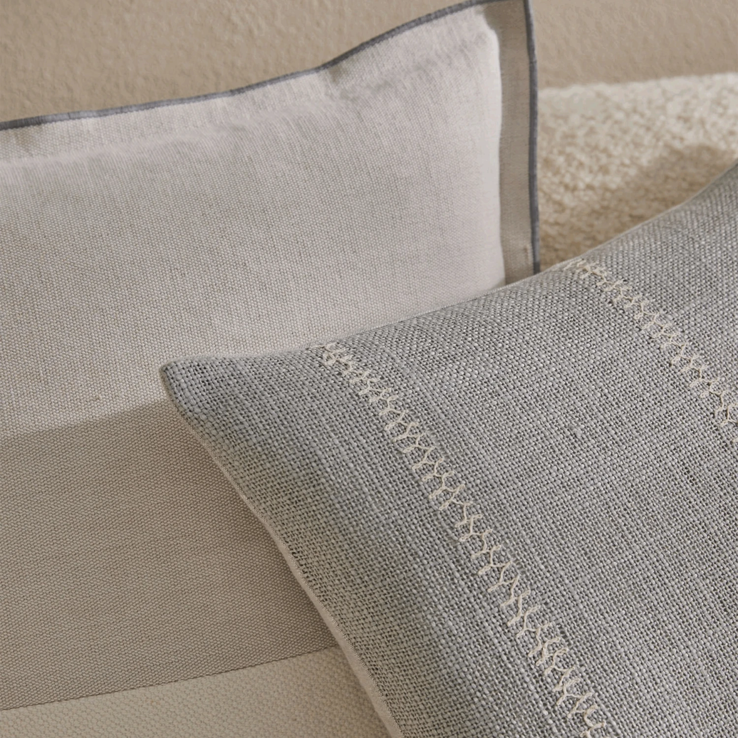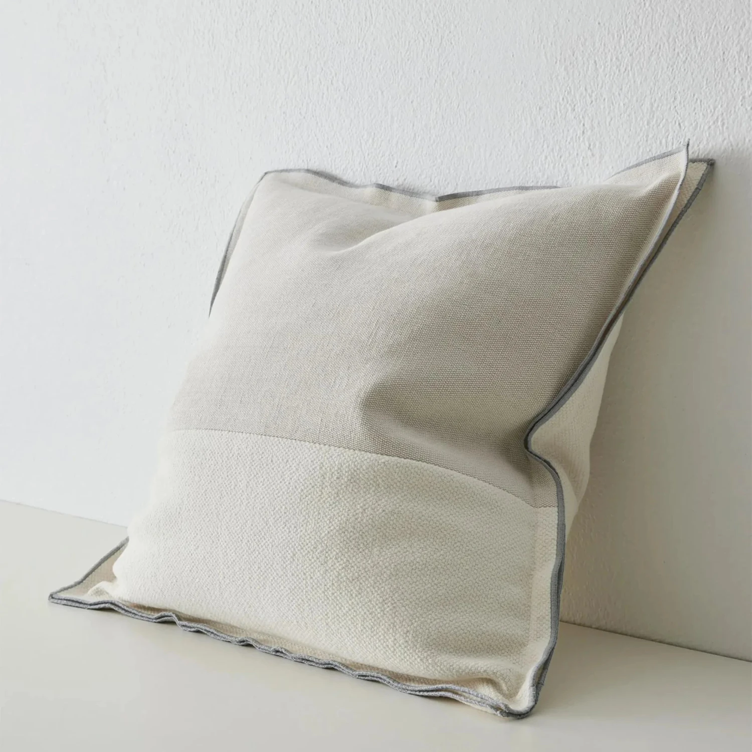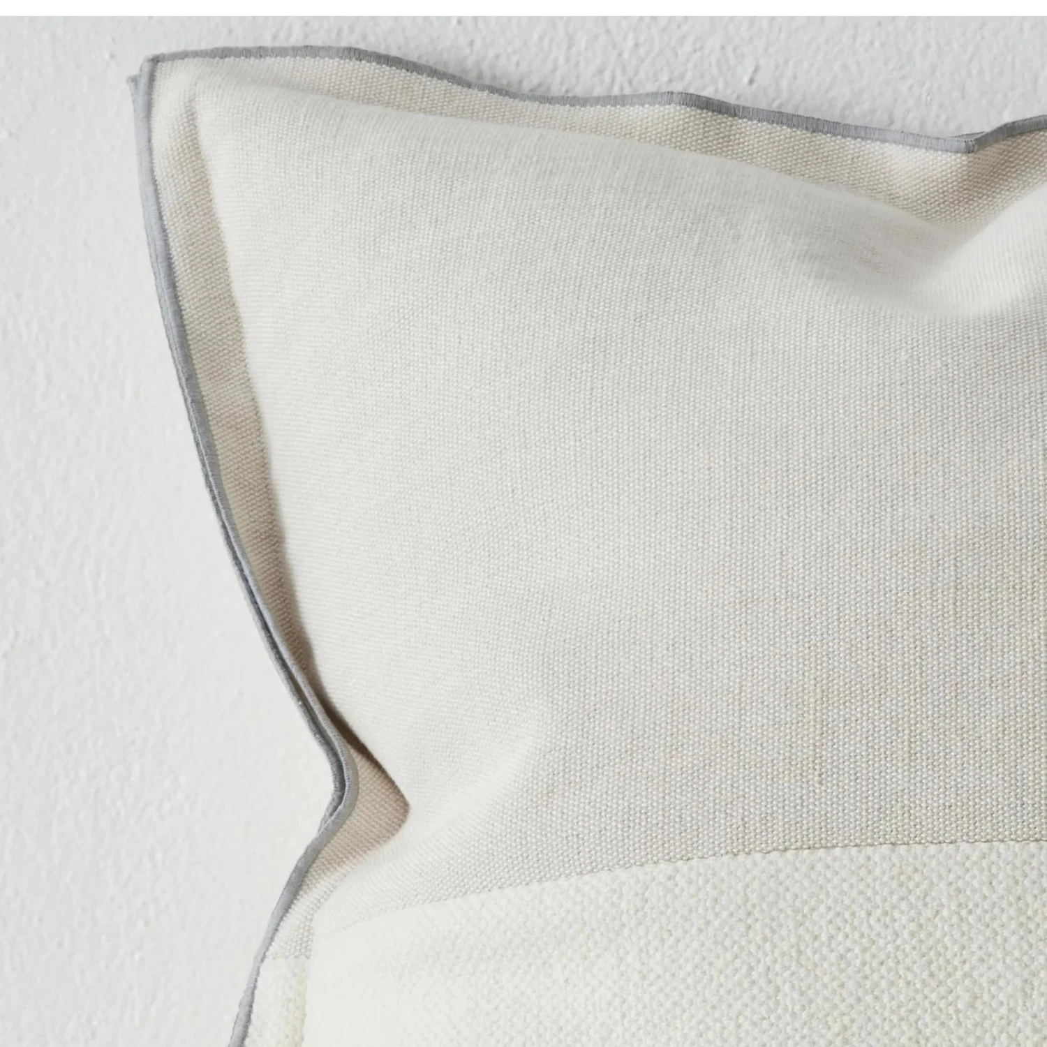 A large scale panel design with the feature of a double flange border. The tranquil palette of Riccardo Glacier pairs a soft, muted pumice with a bright vanilla pop and a cool mist accent around the border. The blend of natural fibres in Riccardo gives this plain weave cushion a sturdy yet soft handle.