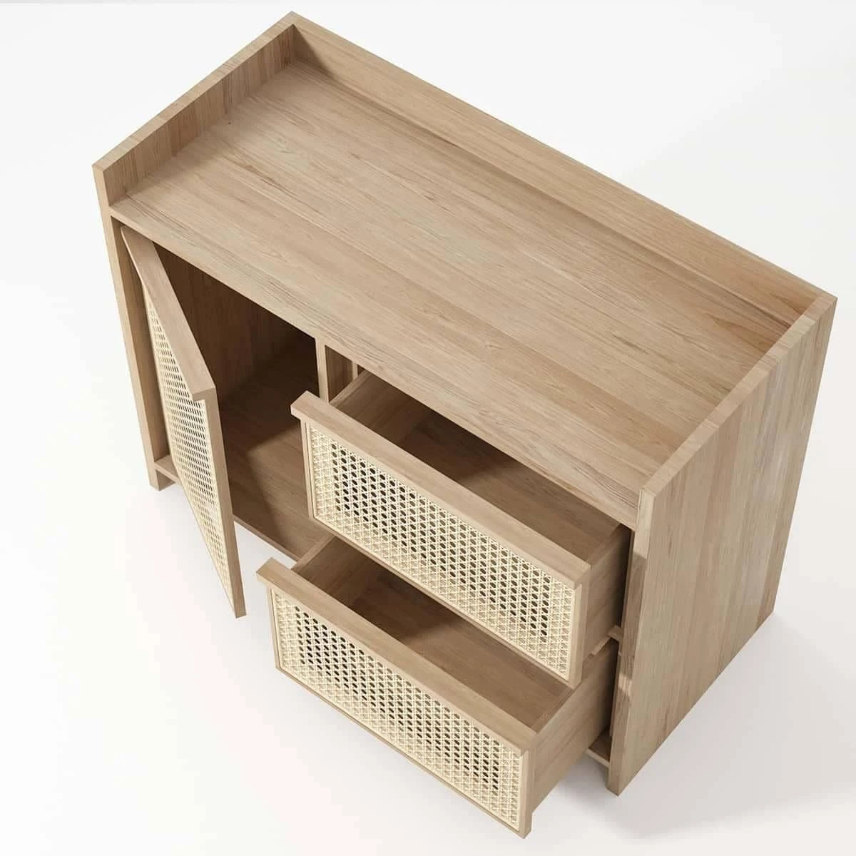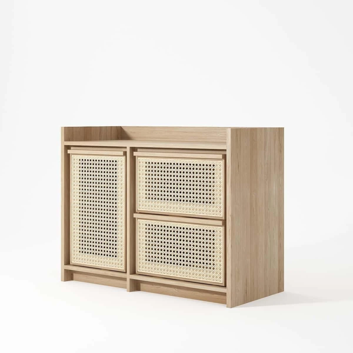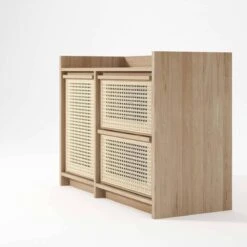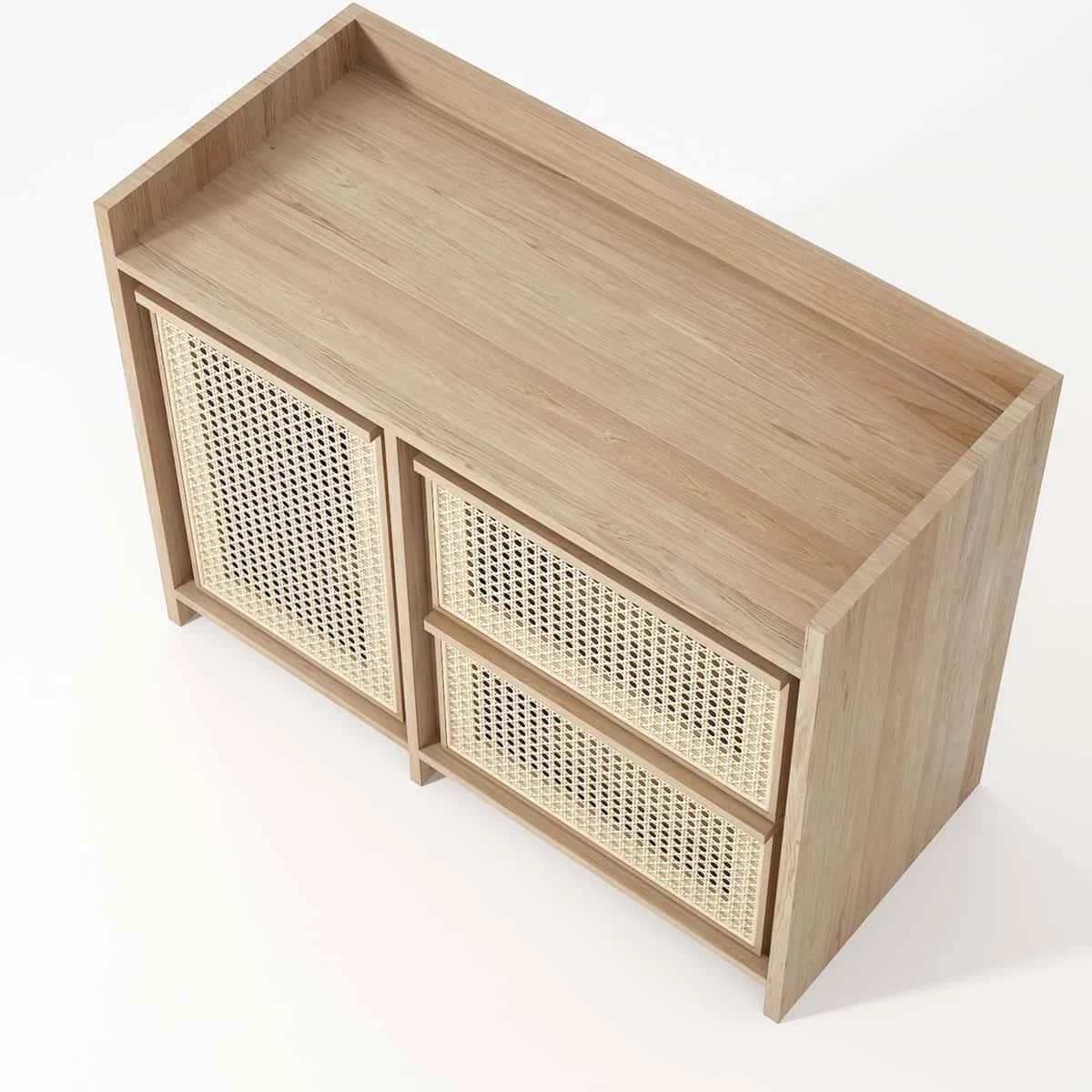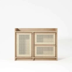 Made from ethically sourced solid European timber, & locally sourced natural rattan from Indonesia, the Roots range is designed for functionality and simplicity for todays environment. The sleek simple detail of the oak frame combined with woven rattan doors allows good air circulation for storage with two large open compartments. It can be used in the bedroom, living room, office or that nook that offers vital extra storage. It’s compact enough to fit just about anywhere, but provide essential storage for todays world.