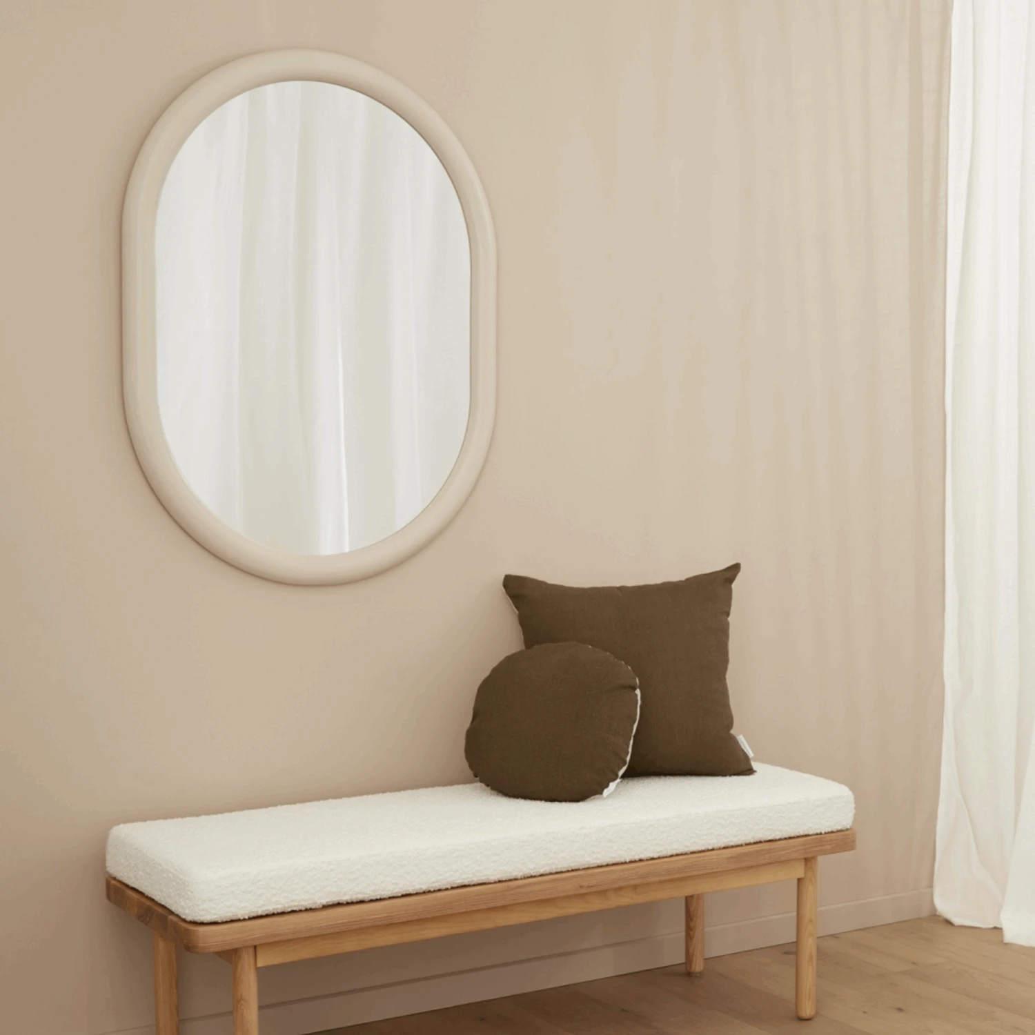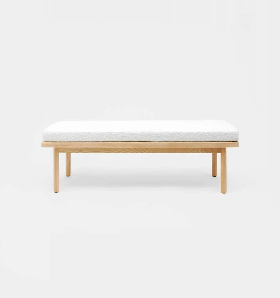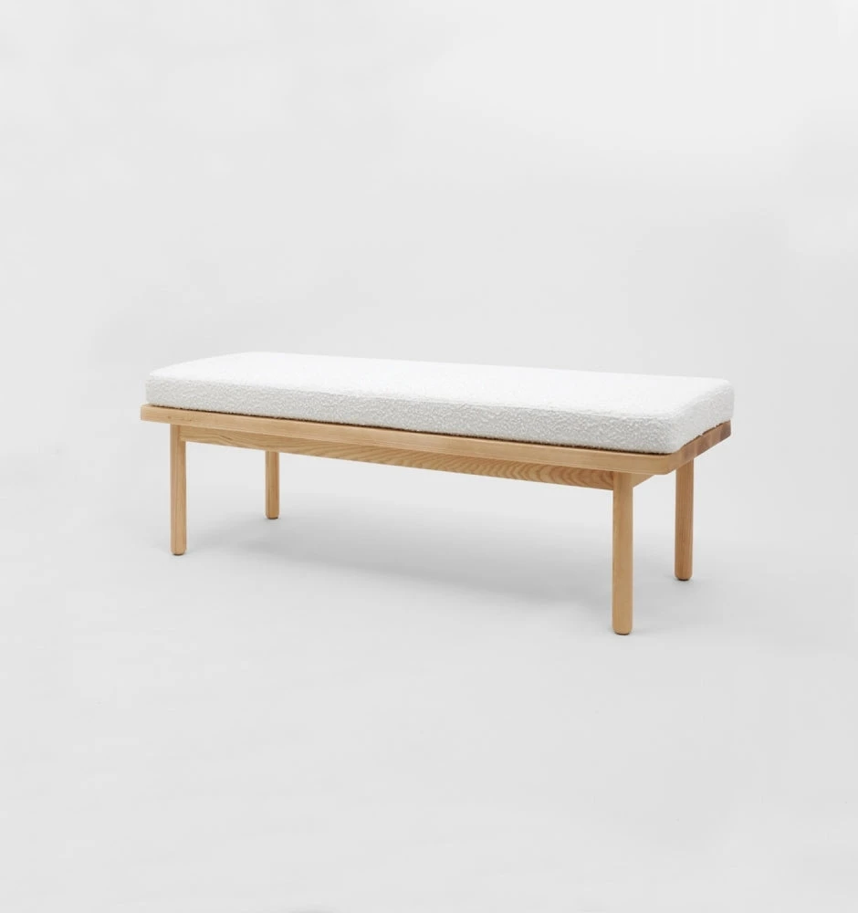 Our Scout benches are simple and adaptable pieces with rounded lines and classic proportions. The Scout series incorporates a varied colour palette across the range. The Ecru/Timber Scout features a removable upholstered textured boucle cushion on a solid Ash timber frame.
