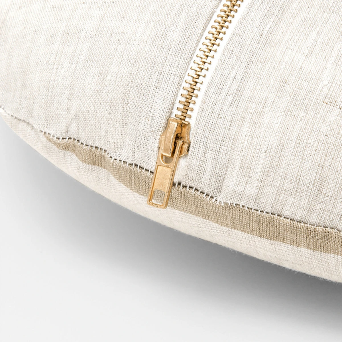 The Stripe Fawn Round Cushion features a natural linen case with a modern screenprinted linear pattern. This cushion contains a feather insert with an exposed brass zip on the reverse.
