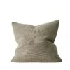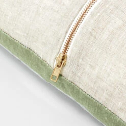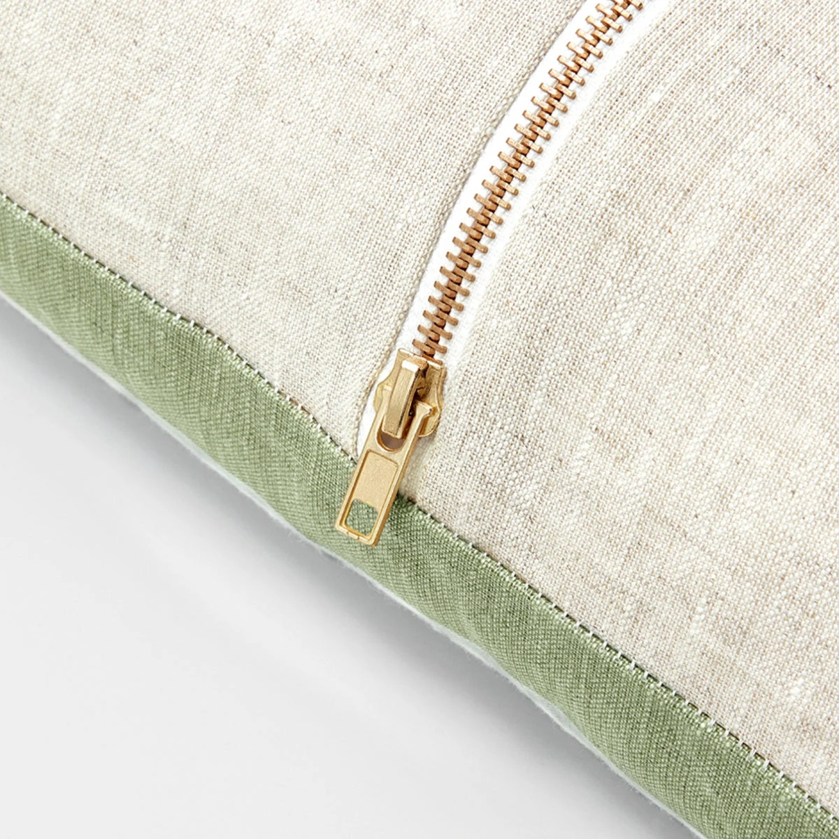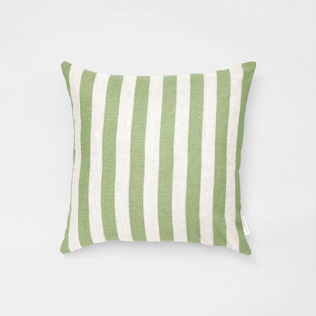 The Middle of Nowhere Stripe Sage Square Cushion features a natural linen case with a modern screenprinted geometric pattern. This cushion contains a feather insert with an exposed brass zip on the reverse.