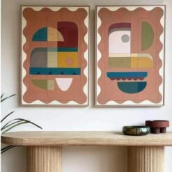 Created using an intensely warm colour palette and a playful geometric design the wavy motif border adds a fun element and interest that contains the warmth radiating from the bold terracotta and inner hues. The artist builds layers of lux oil paint on linen from thin washes to a thick impasto textured style.
