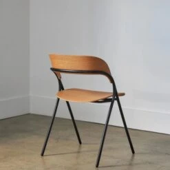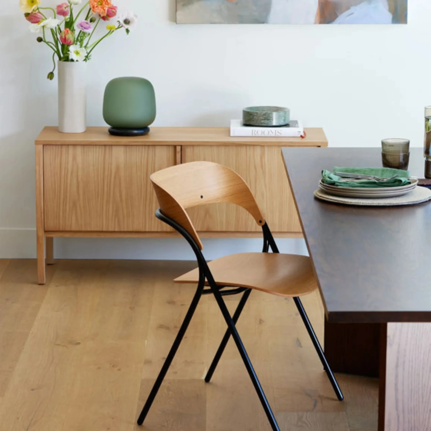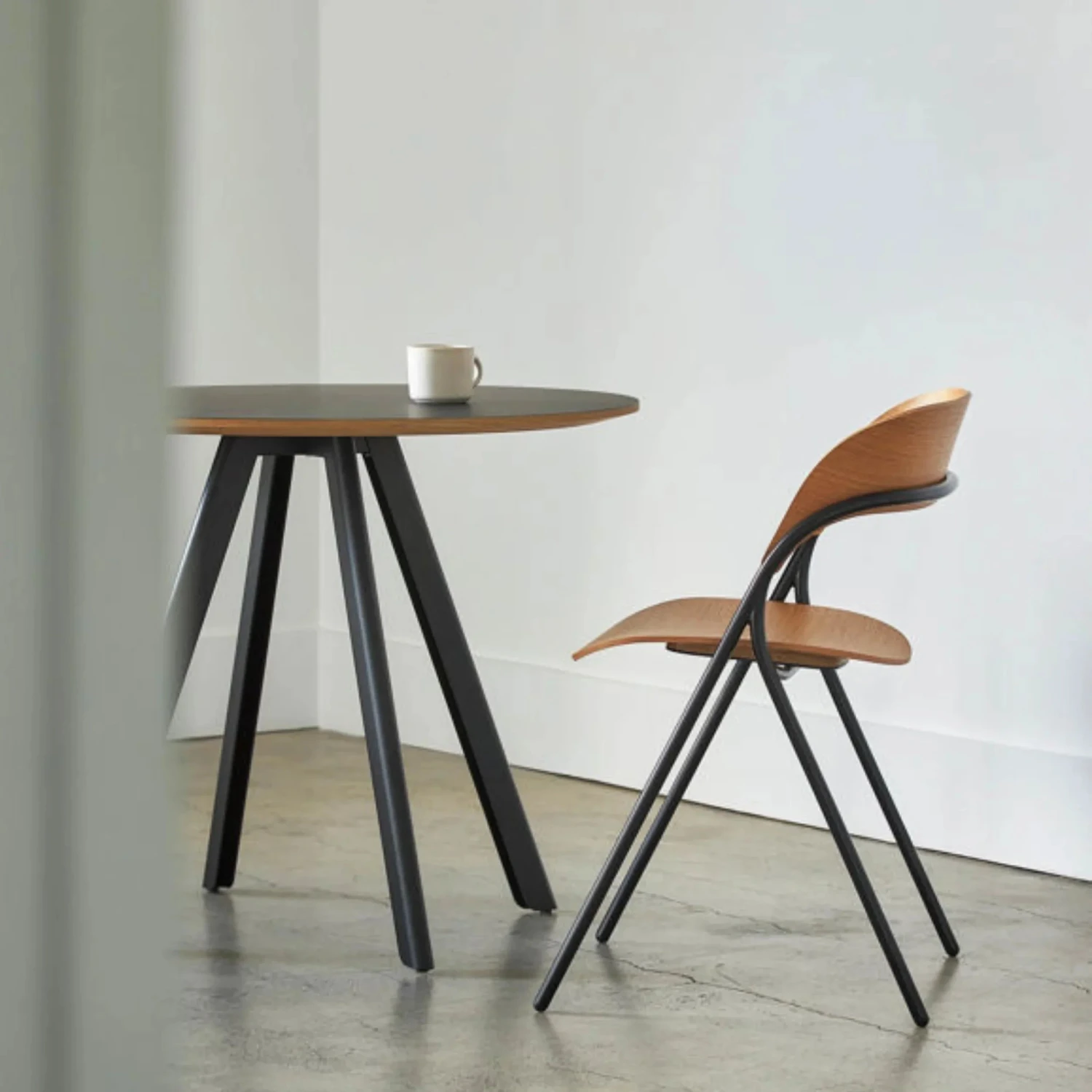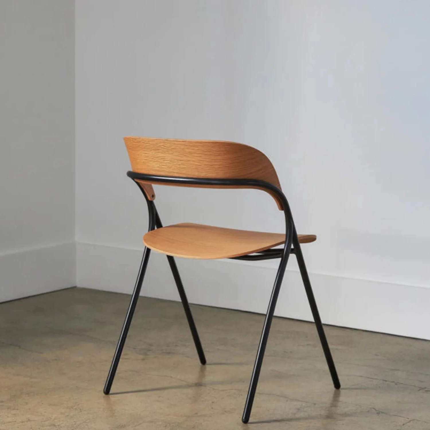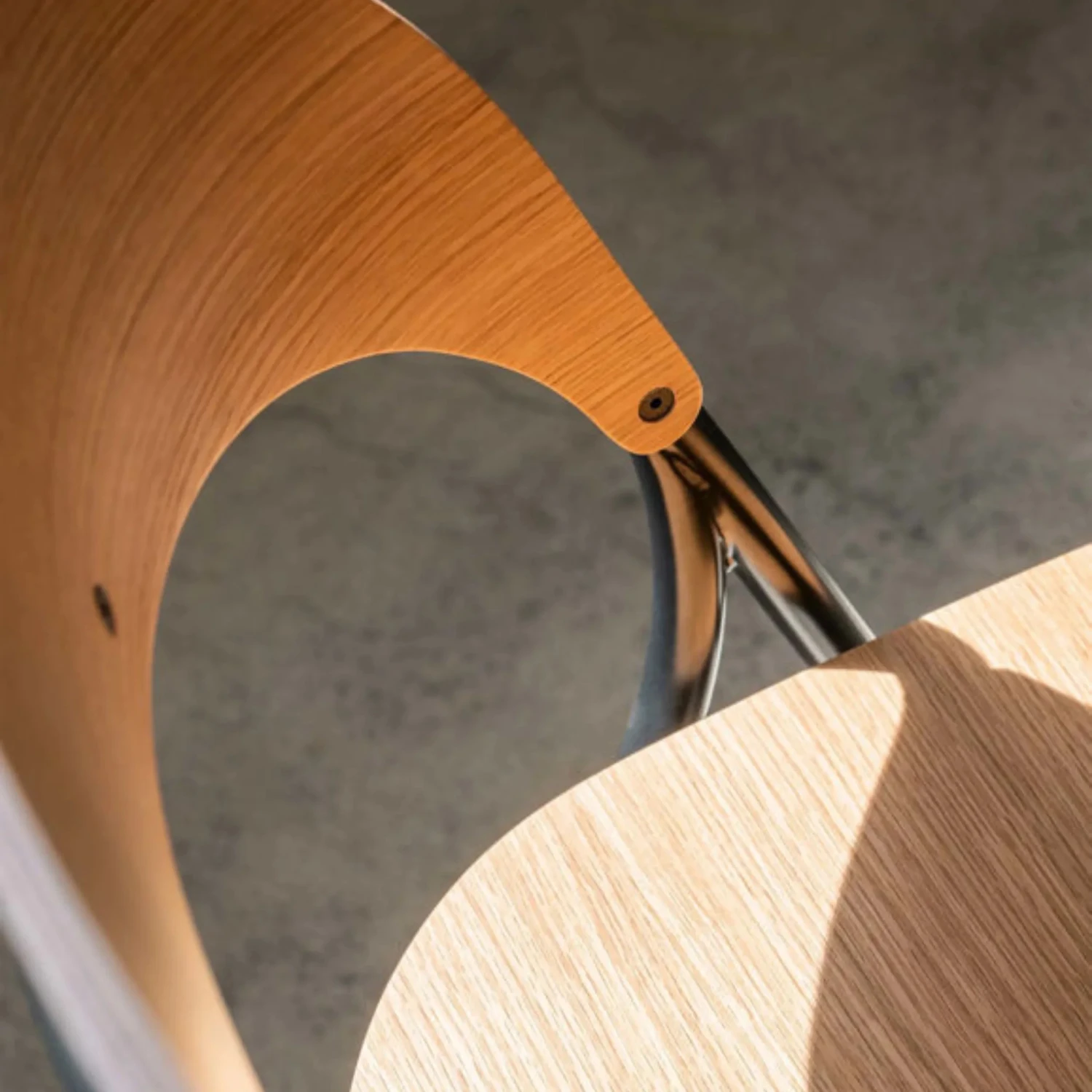 The inspiration behind this unique piece originated from a simple line drawing in space. Straight lines have been replaced with gentle curves giving the chair a softer hand-drawn feel. An exercise in reduction, the Trace Chair is a minimal yet comfortable chair with an elegant and understated character. The name references the subtle curves in the steel legs as it seamlessly traces around the edge of the ply back. The chair showcases clean welds highlighting expert craftsmanship and its distinctive V-shaped legs create a striking silhouette.