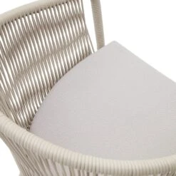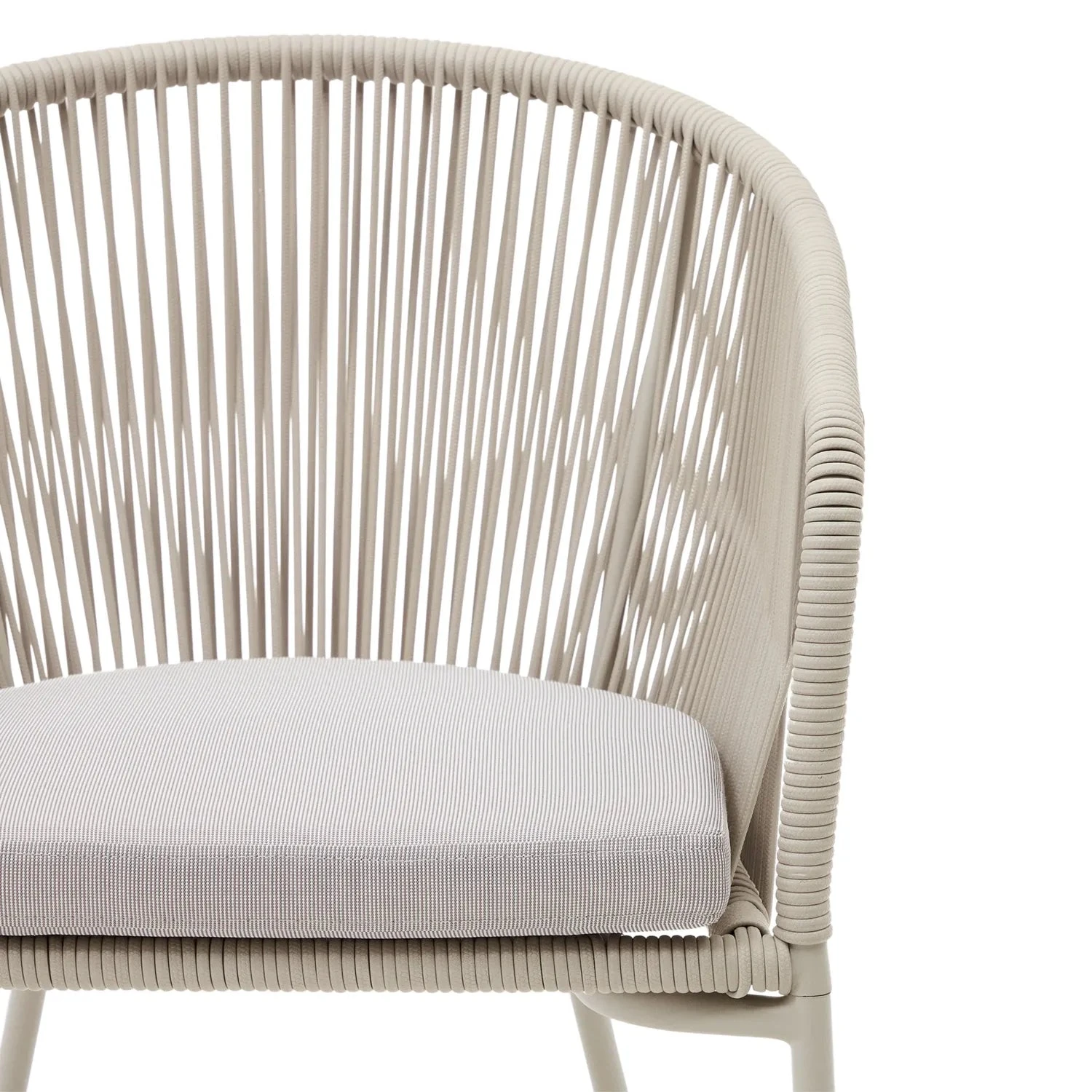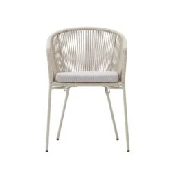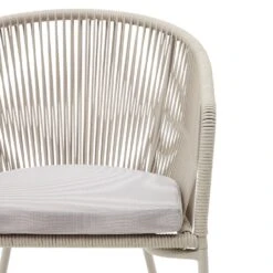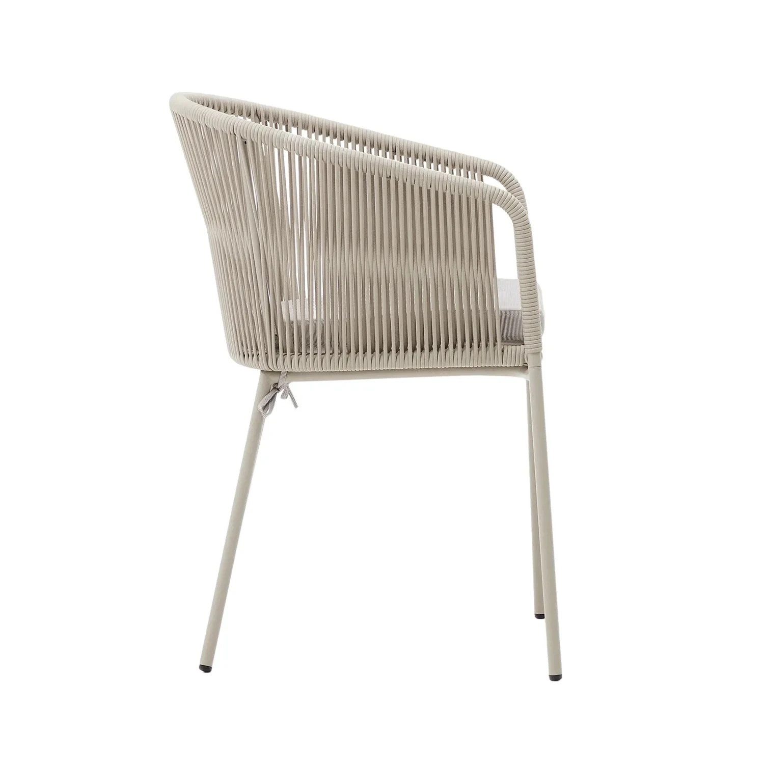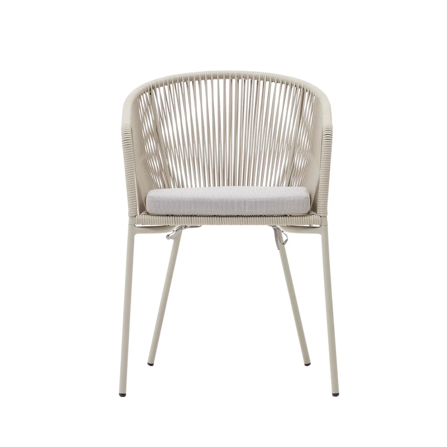Yanet chair, in ecru (light beige), has a rounded back which curves down to be the armrests. The chair is constructed of painted galvanised steel and a hand braided seat in rope (95% polypropylene, 5% polyester) that is resistant to UV rays. A seat cushion is included, which has a removable cover. Cushion fabric is 100% polyester. Suitable for indoor and outdoor use. We recommend that you store cushions away in wet weather. For outdoor care to improve the longevity of this product – store furniture in a dry indoor place. If you want to leave it outdoors, protect it with a waterproof cover in autumn, winter and rainy season.